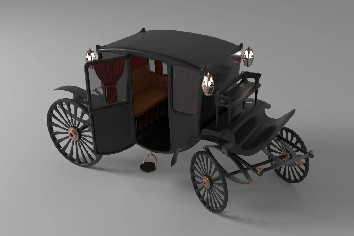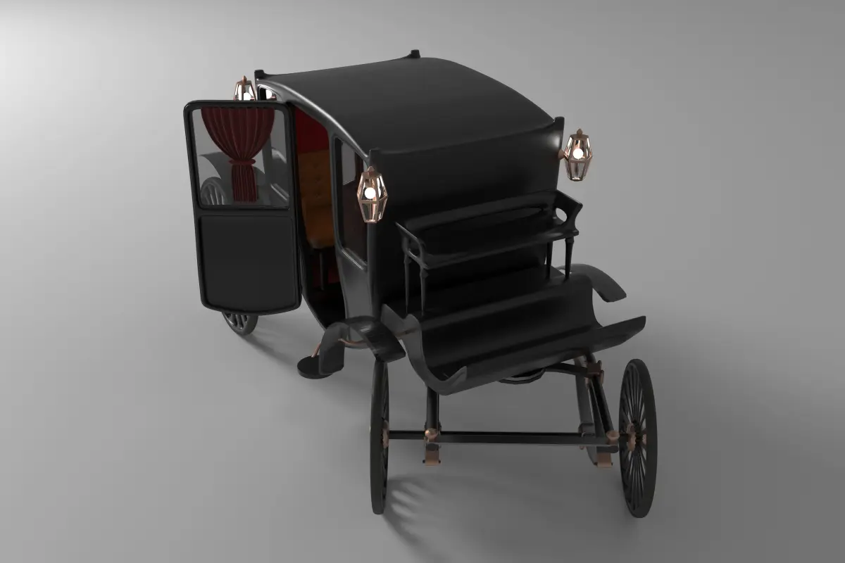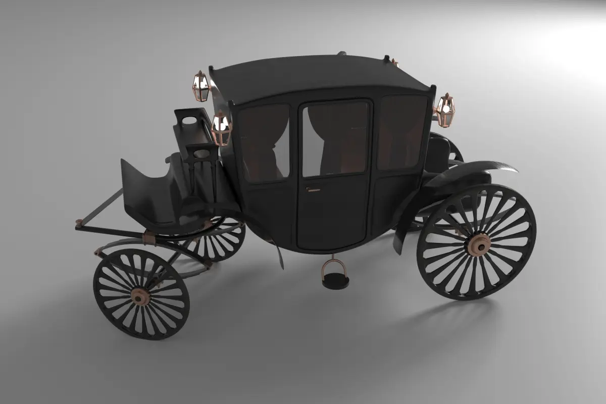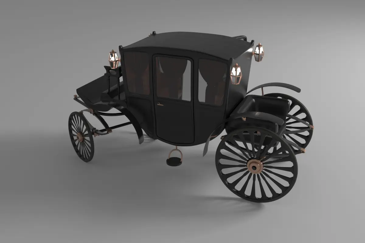 It's an accurate realistic vintage luxury carriage mainly made out of Black Medium Gloss Painted Wood , lines of Medium Gloss Rose Gold, Rubber Plastic wheel tires, Medium Smoked Glass.