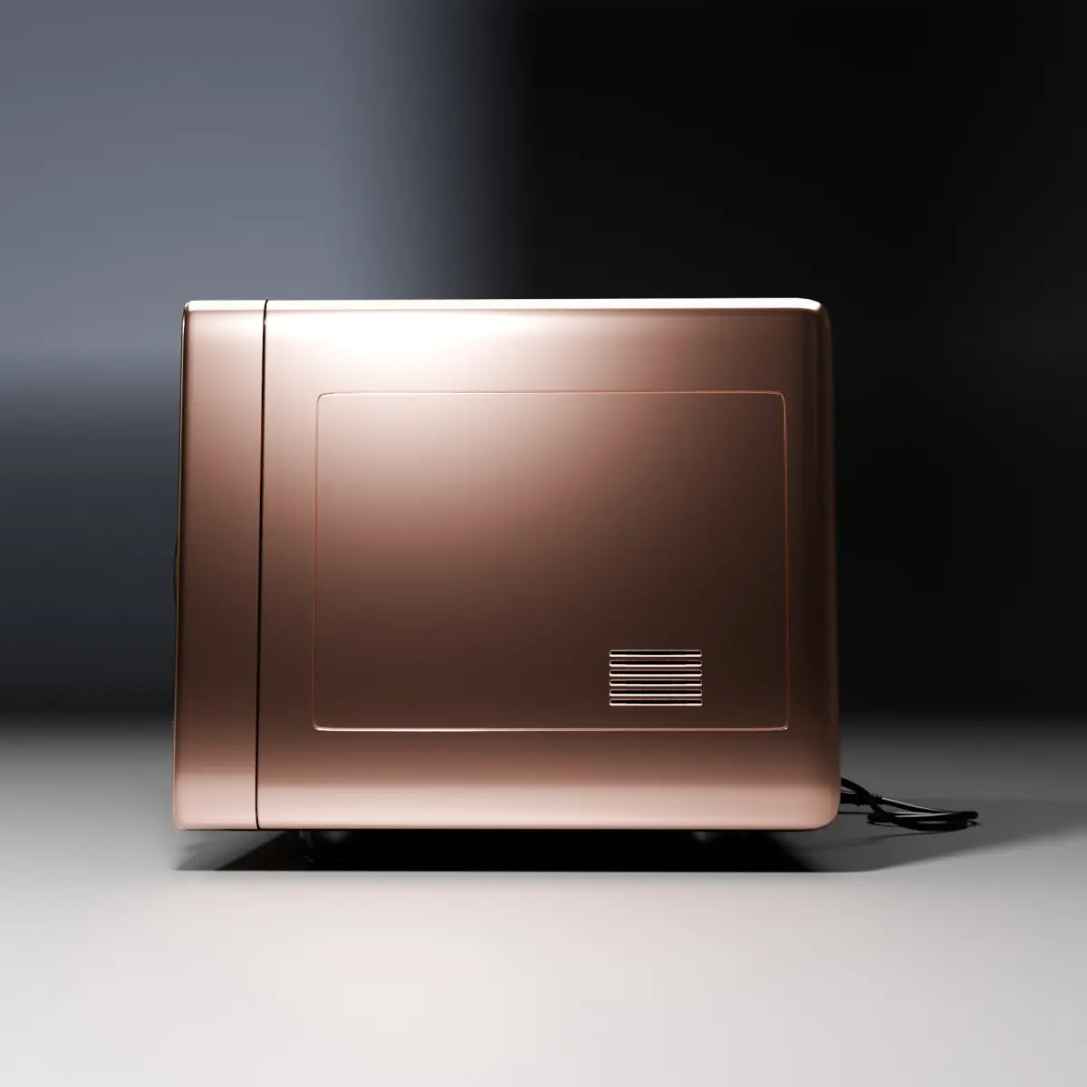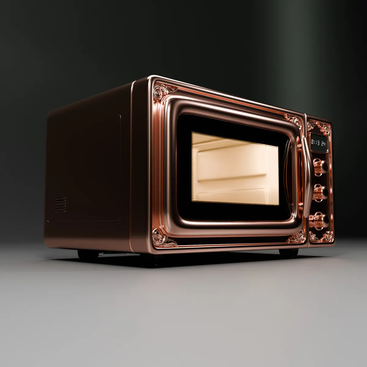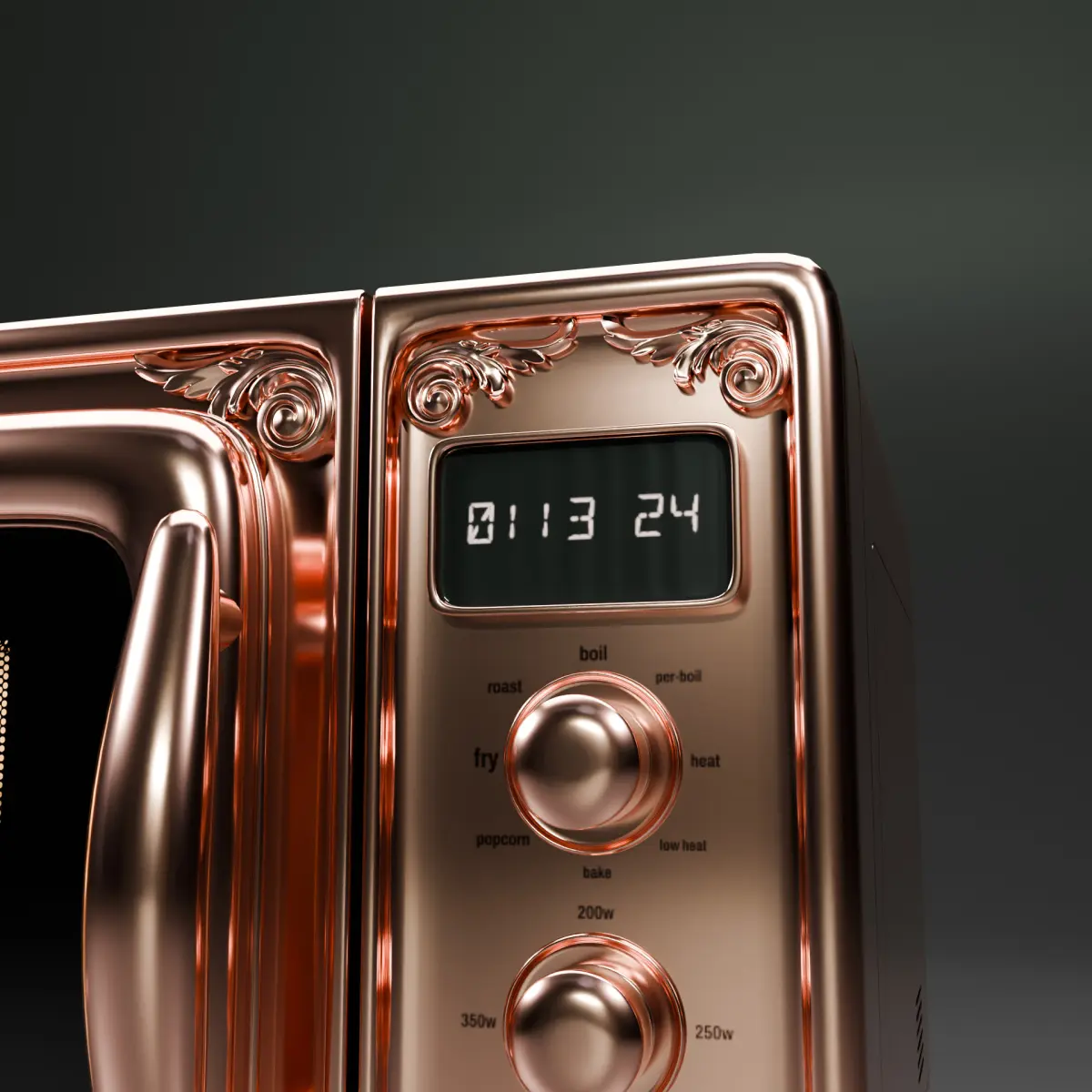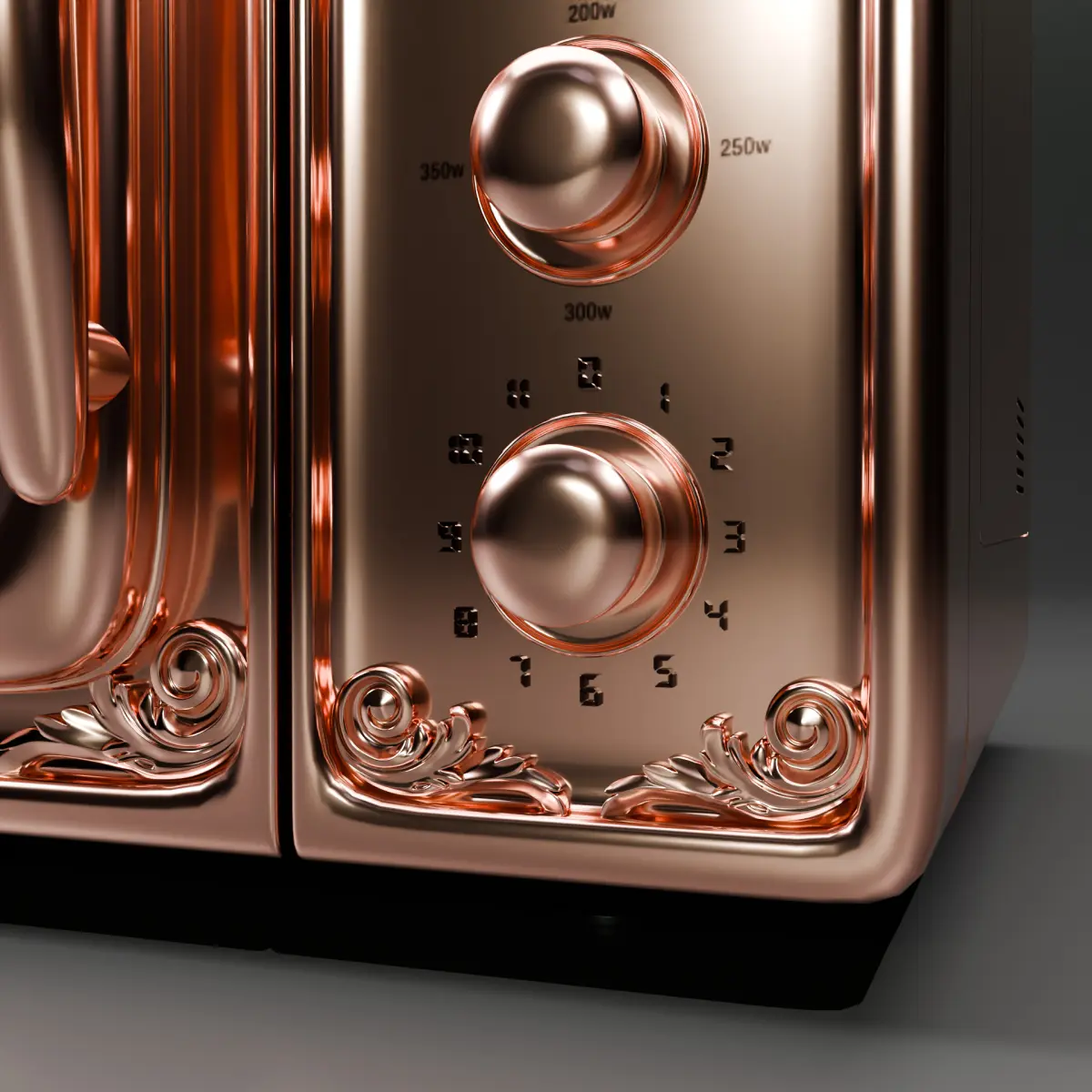 An elegant rose gold microwave oven with a retro design and manual dials, adding a touch of vintage charm to any kitchen.