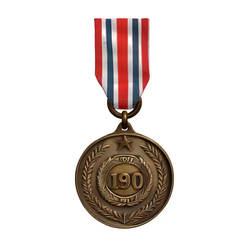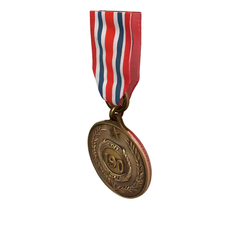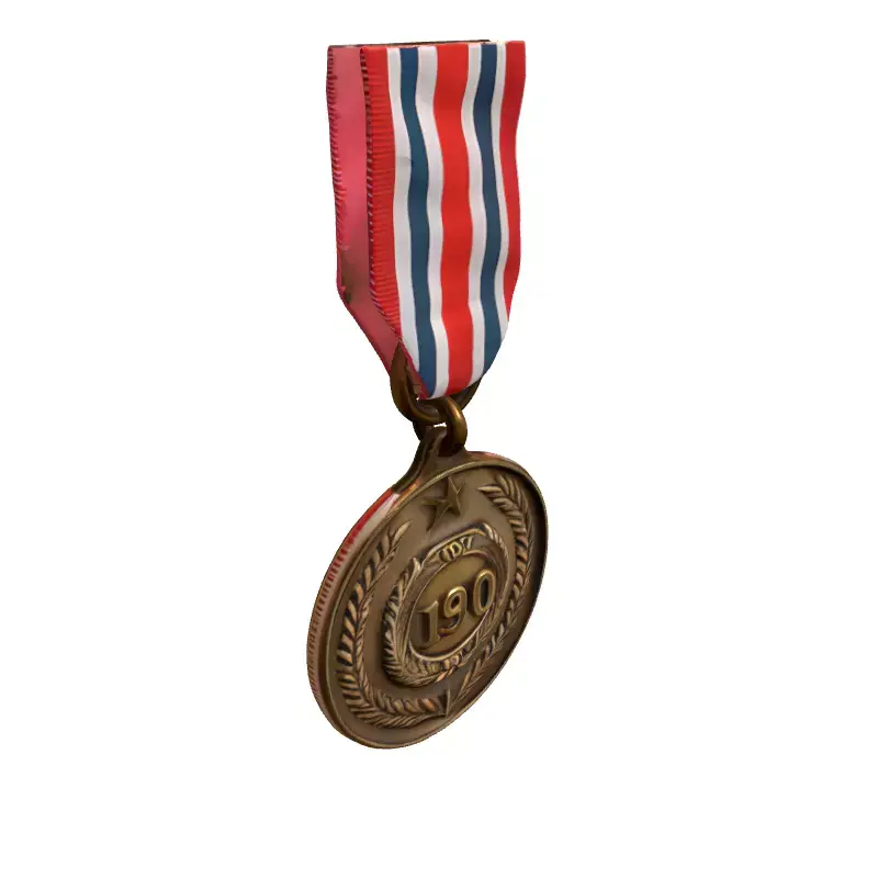This high-quality 3D model meticulously recreates a vintage military commemorative medal complete with its distinctive red, white, and blue striped ribbon. The medal features a bronze-like finish, showcasing intricate detailing with a prominent '190' designation encircled by a laurel wreath, a star at its apex, and subtle date engravings '1994' and '2S'. This asset is ideal for a wide array of digital projects, offering authenticity and historical flair. It is perfectly suited for enriching game environments, particularly historical or military-themed titles, serving as a realistic prop or collectible. Additionally, it can enhance architectural visualization scenes, add depth to virtual reality (VR) and augmented reality (AR) experiences, or be integrated into compelling digital art and animation projects. The model is crafted with clean, optimized topology, ensuring smooth performance and easy integration into various pipelines. It comes fully UV unwrapped with professionally crafted PBR (Physically Based Rendering) textures, guaranteeing realistic material representation and lighting interactions across diverse rendering engines. While highly detailed for static renderings and close-up shots, it can also be adapted for real-time applications with appropriate level-of-detail (LOD) adjustments. Supported file formats typically include GLB, OBJ, STL, ABC, DAE, FBX, USD, and PLY, providing broad compatibility for your creative needs.