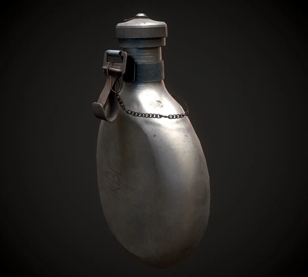 This is the highly detailed low-poly 3D model of a Vintage aluminium military water flask.
