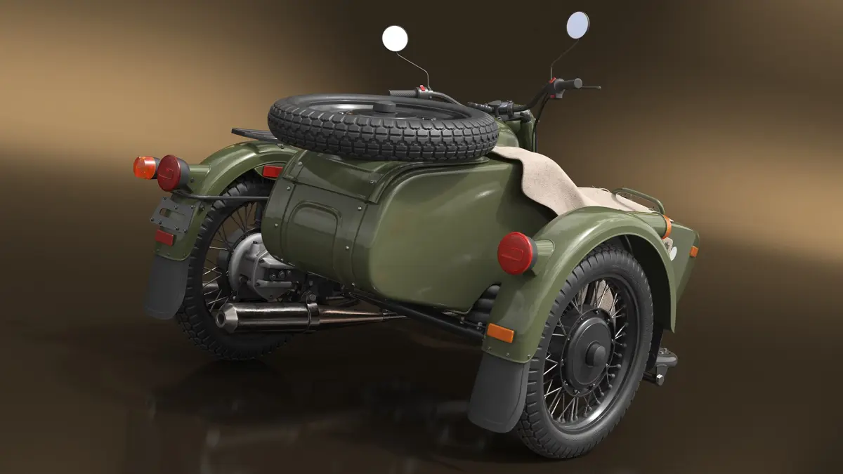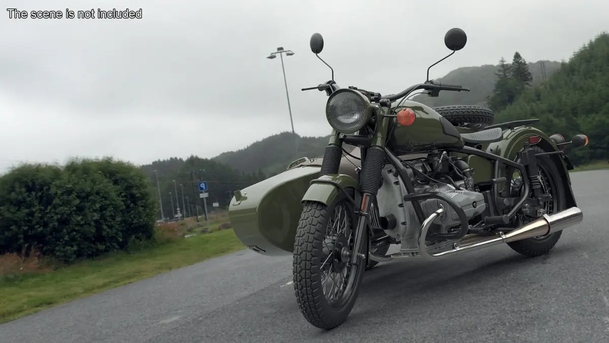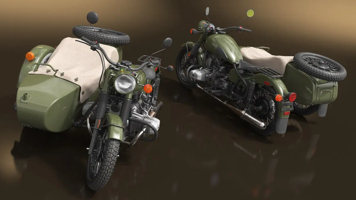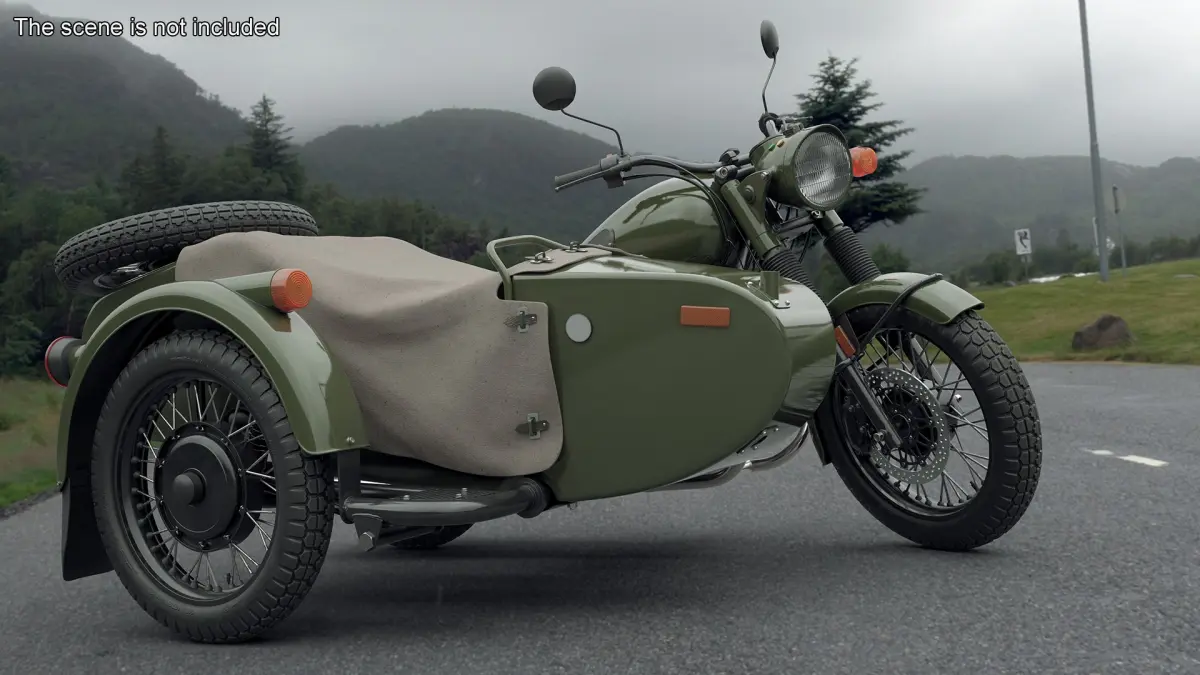 Vintage Motorcycle with Sidecar Rigged for Maya is a 3d model of a classic motorcycle featuring an attached sidecar, offering a vintage and rugged design reminiscent of mid-20th-century military vehicles.
