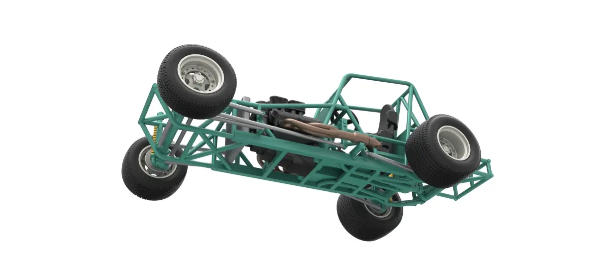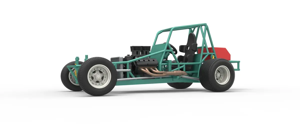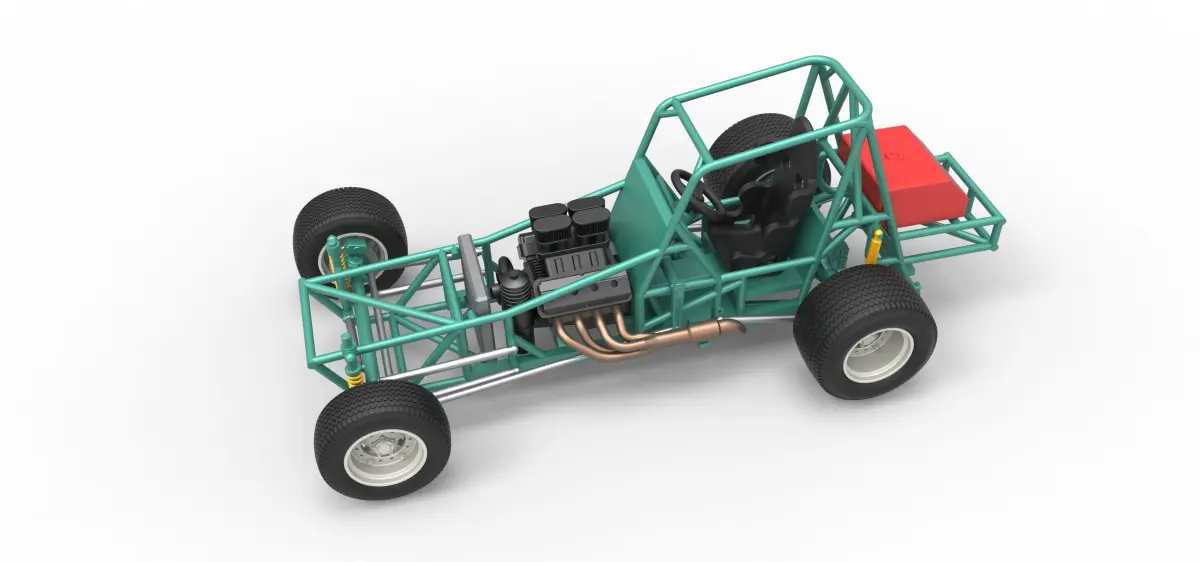 The model consists of parts: Body, Engine air intake, Engine left part, Engine main part, Engine right part, Front left rim, Front left tire, Front right rim, Front right tire, Left exhaust pipes, Radiator, Rear left tire, Rear right tire, Rear rims, Right exhaust pipes, Seat, Shifter, Steering wheel, Tank.