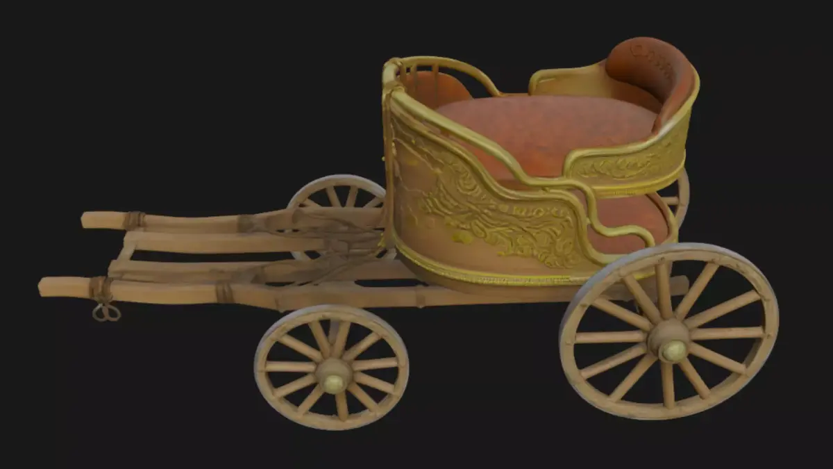 This exquisitely detailed 3D model captures an ancient wooden carriage from a bygone era, featuring luxurious tufted leather seating in rich brown tones, intricate gold filigree accents along the curved body, elegant lantern posts with glowing lamps, large spoked wheels with metallic rims, and a long extending drawbar for horse attachment. Rendered with high-poly precision on a transparent background for seamless integration into historical scenes, fantasy renders, games, or animations, this asset evokes royal elegance and timeless craftsmanship, complete with ornate engravings, brass hardware, and realistic wood grain textures.