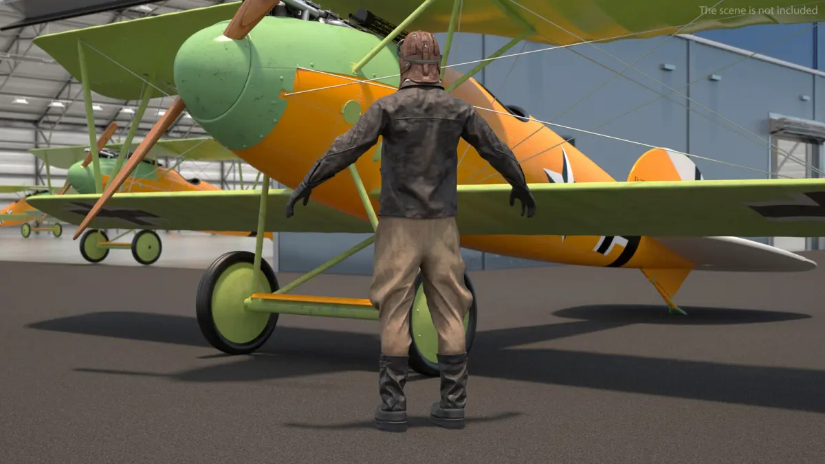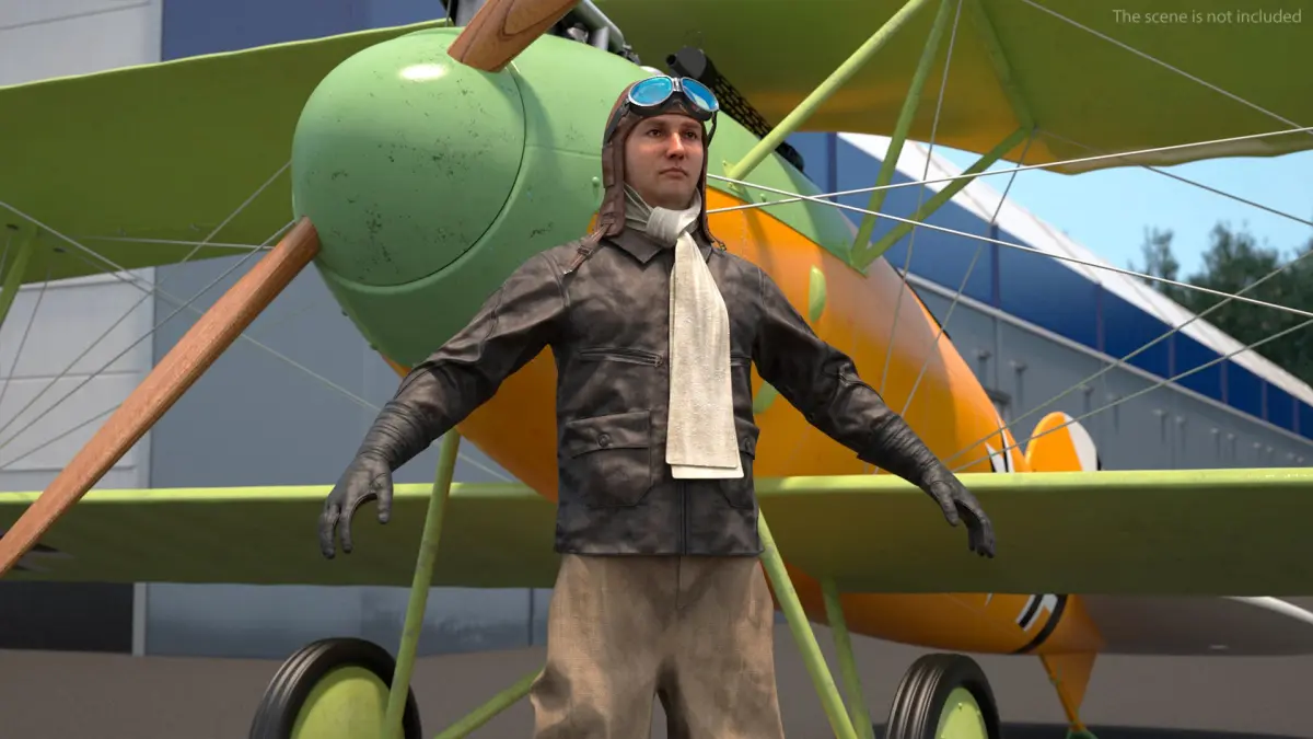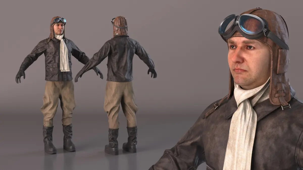 The character wears a vintage pilot uniform, which includes elements like a leather flight jacket, aviator cap, goggles, and a scarf. Details such as patches, buttons, and insignias are visible and accurately placed, enhancing the authenticity of the vintage look.The character stands with a neutral, relaxed posture that is symmetrical and easy to manipulate for rigging purposes.
