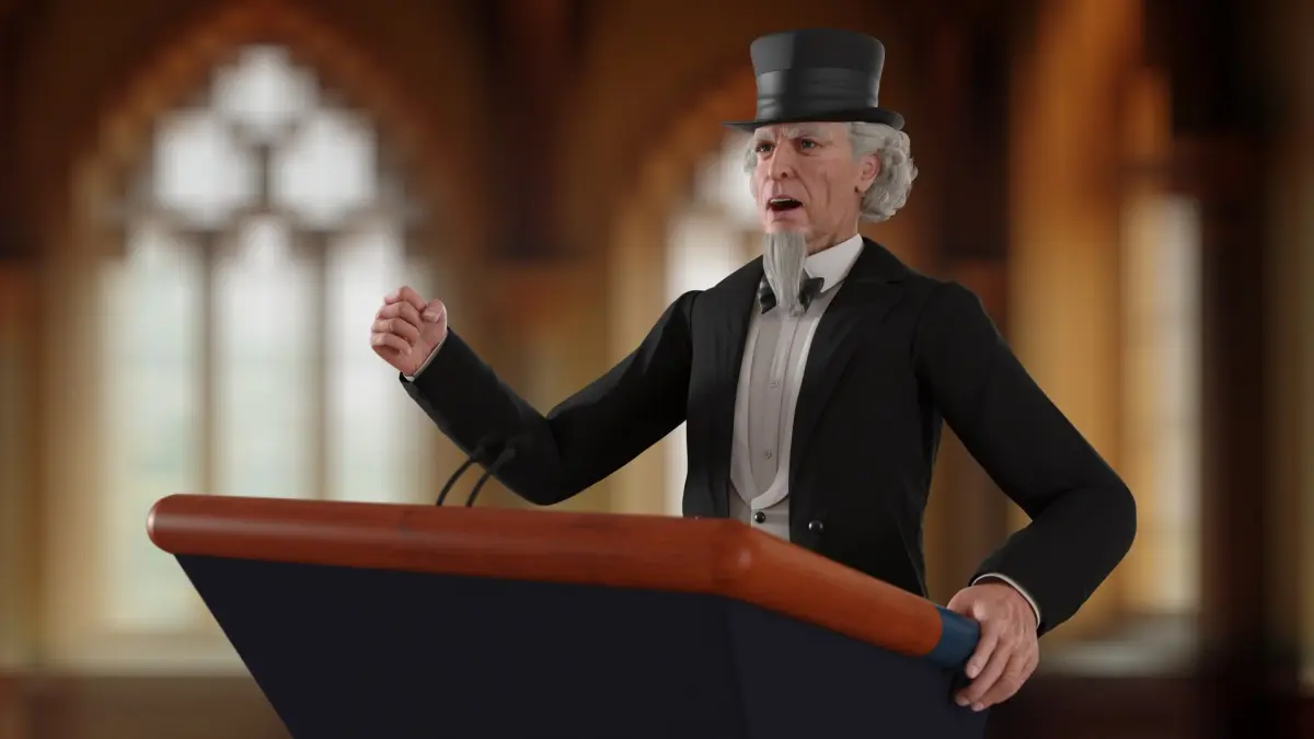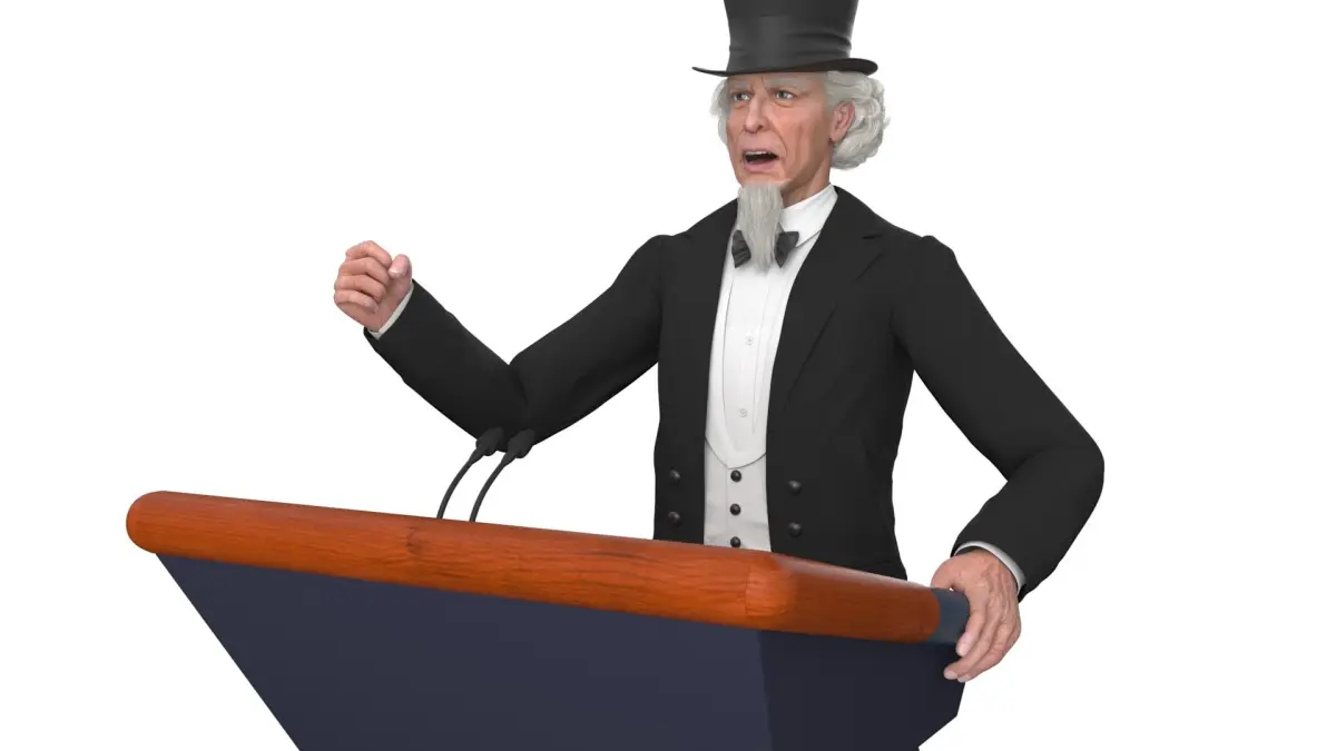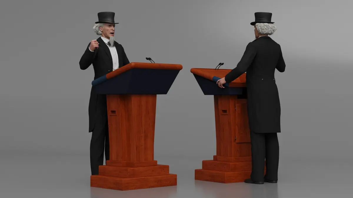 This model features intricate details, including a traditional suit and a classic top hat, embodying a sense of historical and formal elegance. The podium adds a realistic touch, making it suitable for scenes requiring a speaker or orator. The character's expressive pose and refined attire make it a versatile addition to various creative projects.