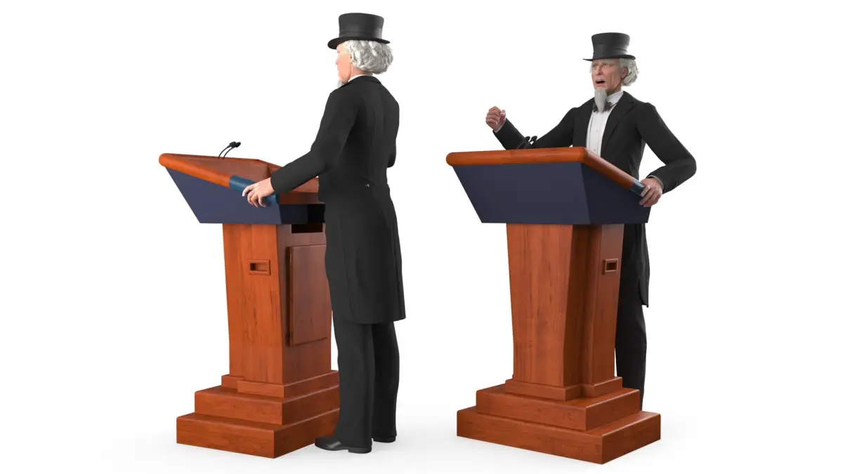 Vintage Politician at Conference Lectern is a three-dimensional model of distinguished gentleman figure, complete with a top hat, standing behind a podium giving a speech.