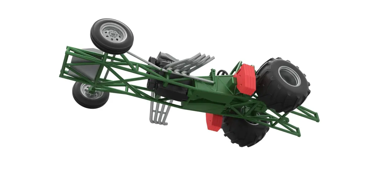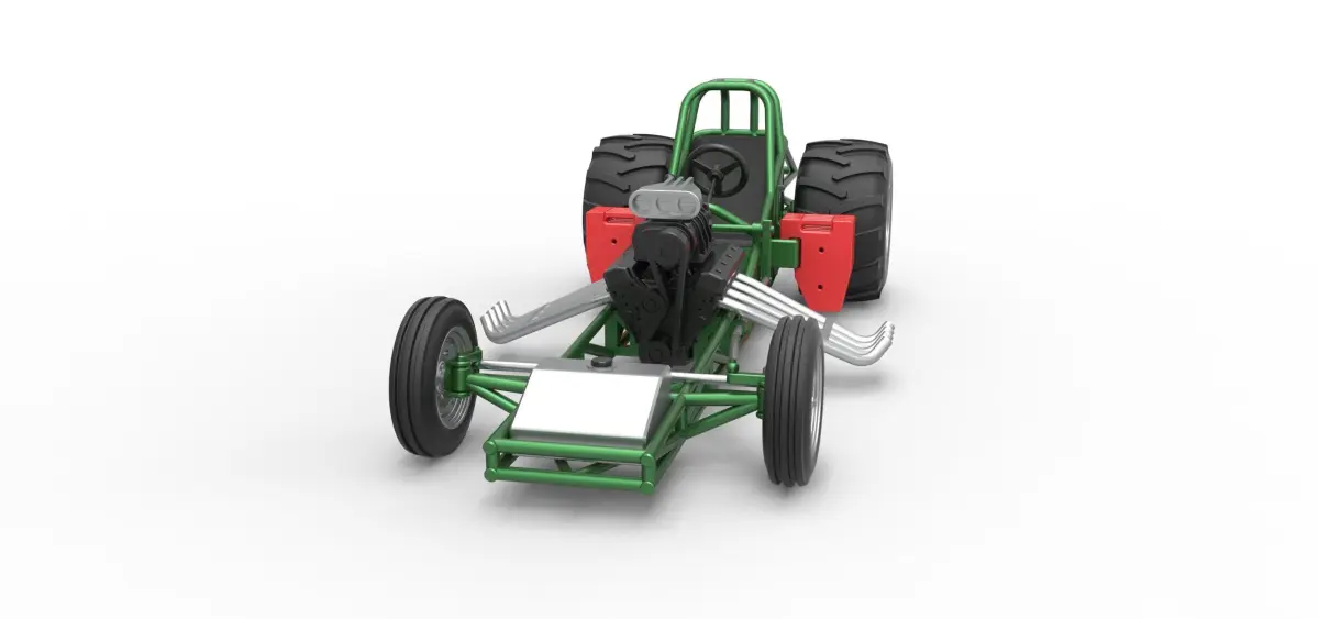 The model consists of parts: Engine, Frame, Front rims, Front tires, Left exhaust, Rear hubs, Rear rims, Rear tires, Right exhaust, Scoop, Shifter, Steering wheel, Tank, Weight plates.