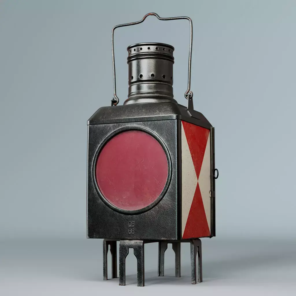 A vintage German Railway tail lamp (End-of-Train Device, in german: Zugschlusslaterne) used on the last car to mark the end of a train. Its red signal ensured visibility at night and in poor weather; carrying handle, and a bracket for quick mounting on the buffer beam. Earlier versions ran on kerosene, later ones on electric bulbs, but the robust, utilitarian form stayed consistent for decades. This model captures that iconic design for scenes set on German railways, depots, and heritage operations.