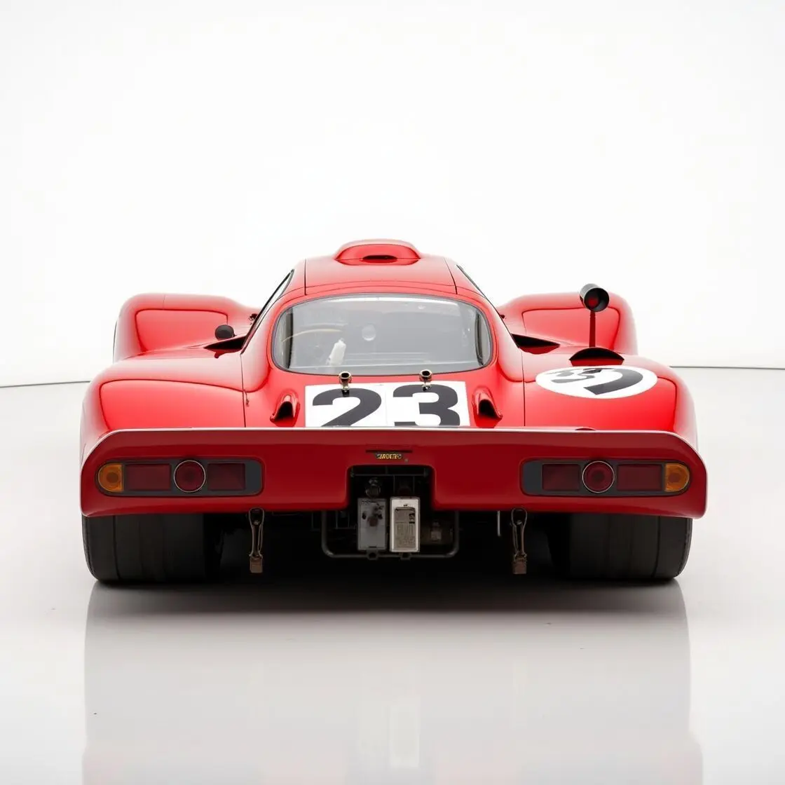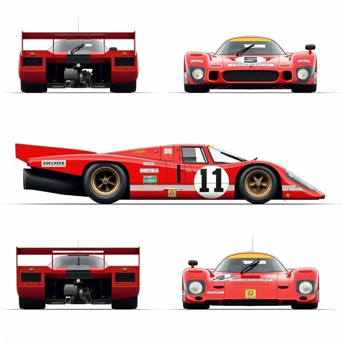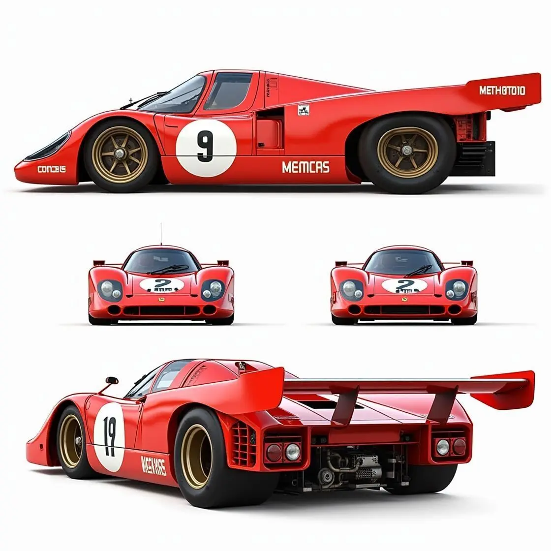 A stunning 3D model of a classic red Porsche Style race car, an iconic endurance racer. The model features authentic racing livery with large white number 3 decals on the front and sides, white stripe accents, and various sponsor logos. Details include prominent headlights, sleek aerodynamic bodywork, a large rear wing, and realistic racing tires with yellow lettering. The car is presented from a dynamic high-angle view against a clean, neutral grey background, highlighting its legendary design and historical significance. This highly detailed model is perfect for automotive enthusiasts, historical racing simulations, or any project requiring a classic sports car.