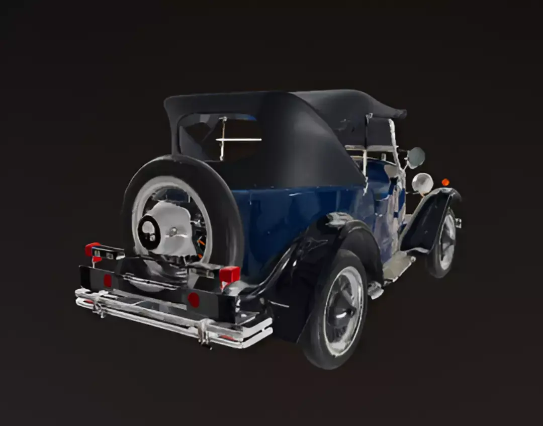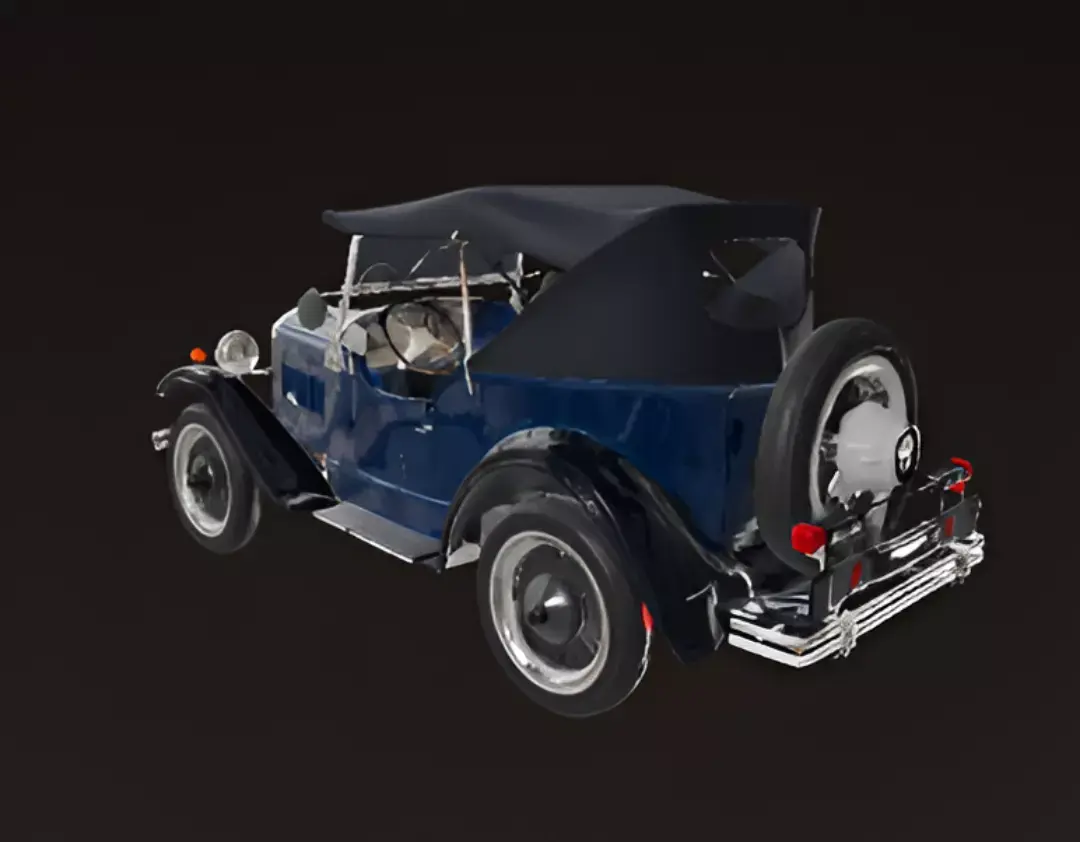 A classic, dark blue vintage roadster is shown from a front-quarter view in a studio setting. The car has an open-top design with a black canvas convertible roof and a light brown leather interior. It features large, separate headlights, an ornate front grille, and prominent fenders over thin, spoked wheels. The vehicle's paint has a deep, glossy finish that contrasts with the golden-brown color of the wheels and the bright chrome accents on the bumpers and grille. A European license plate is visible on the front bumper. The overall appearance is that of a well-preserved or restored antique automobile.