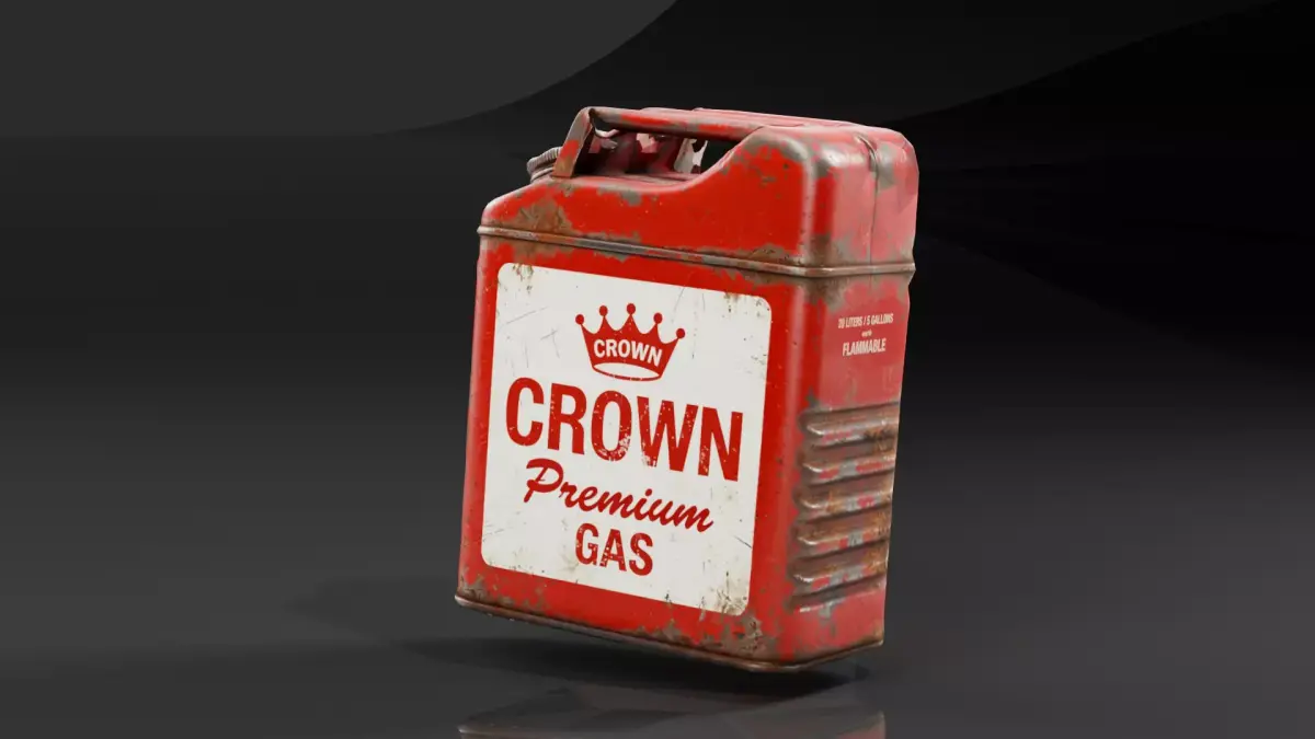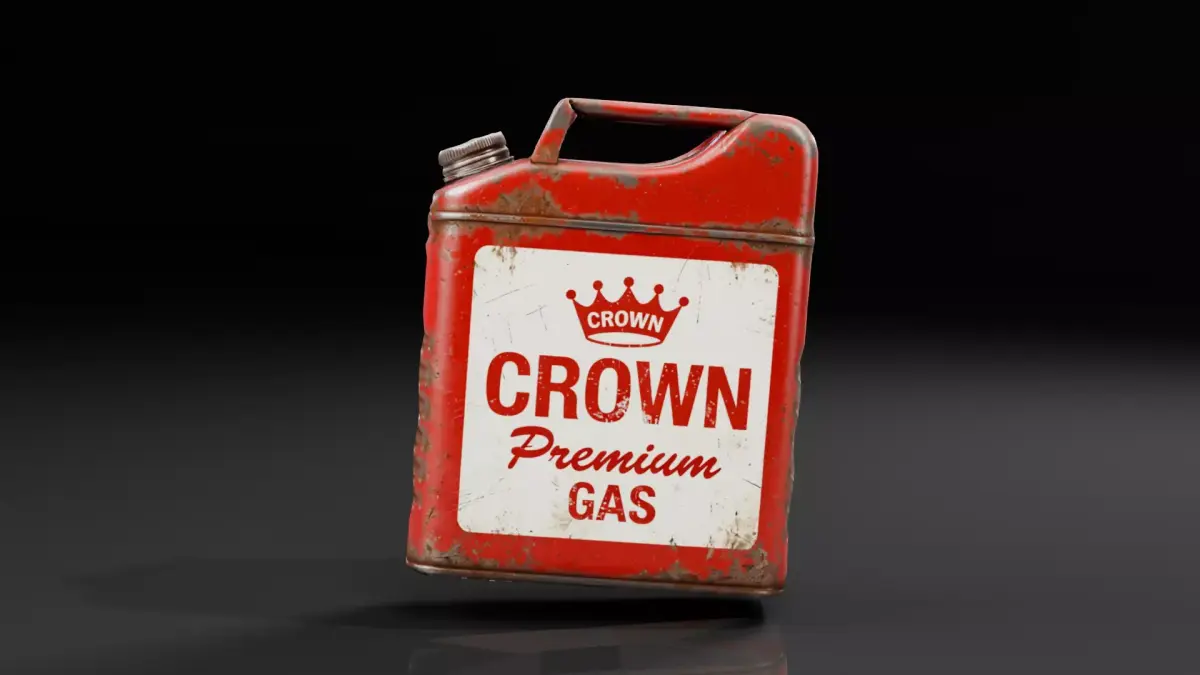 The model features custom, fictional Crown Premium Gas branding to avoid copyright issues. The textures showcase significant wear, realistic rust accumulation along the seams and edges, and faded paint, giving it a highly authentic, long-forgotten look. It includes classic design elements like the triple-bar handle and twist-off cap.