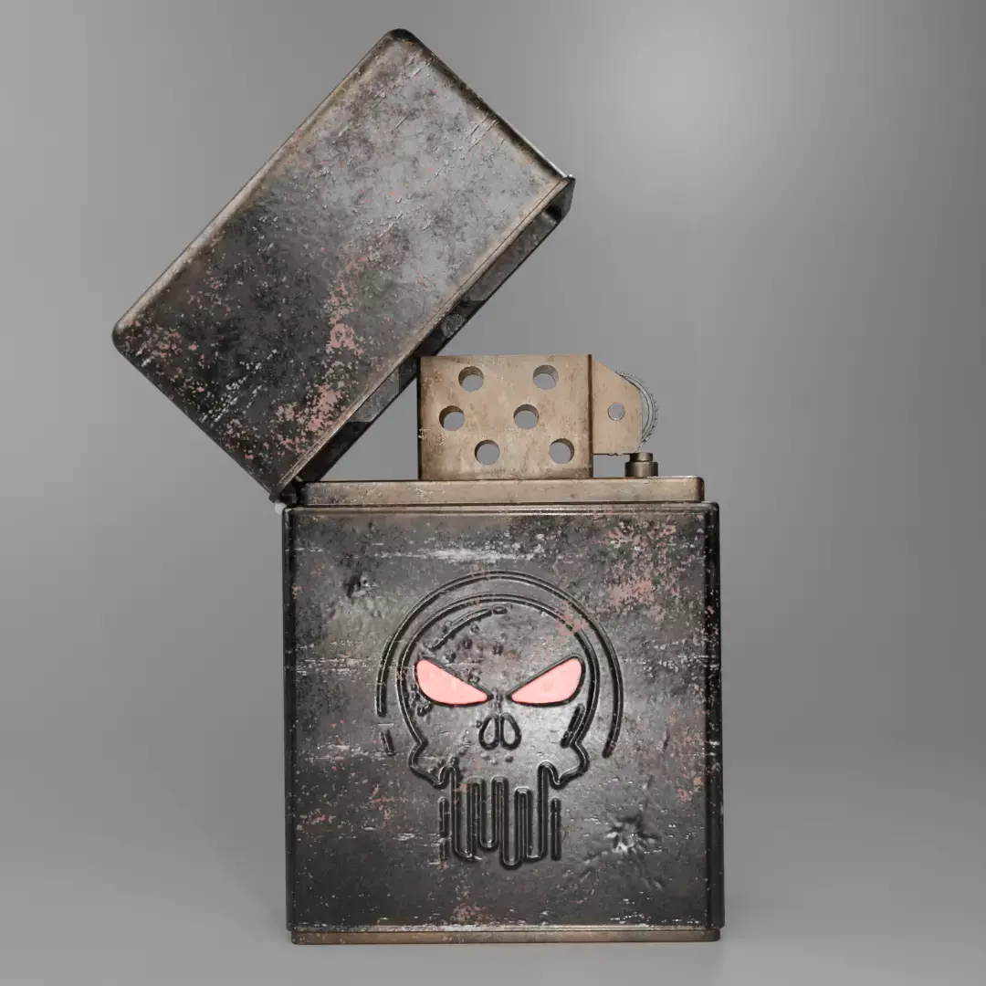 This is a high-quality PBR 3D model of a lighter with a skull engraving, ideal for use in games, renders, animations, or cinematic projects.The model is fully textured and optimized, with clean UVs and realistic materials. It has a slightly worn and scratched metal surface for an authentic look.