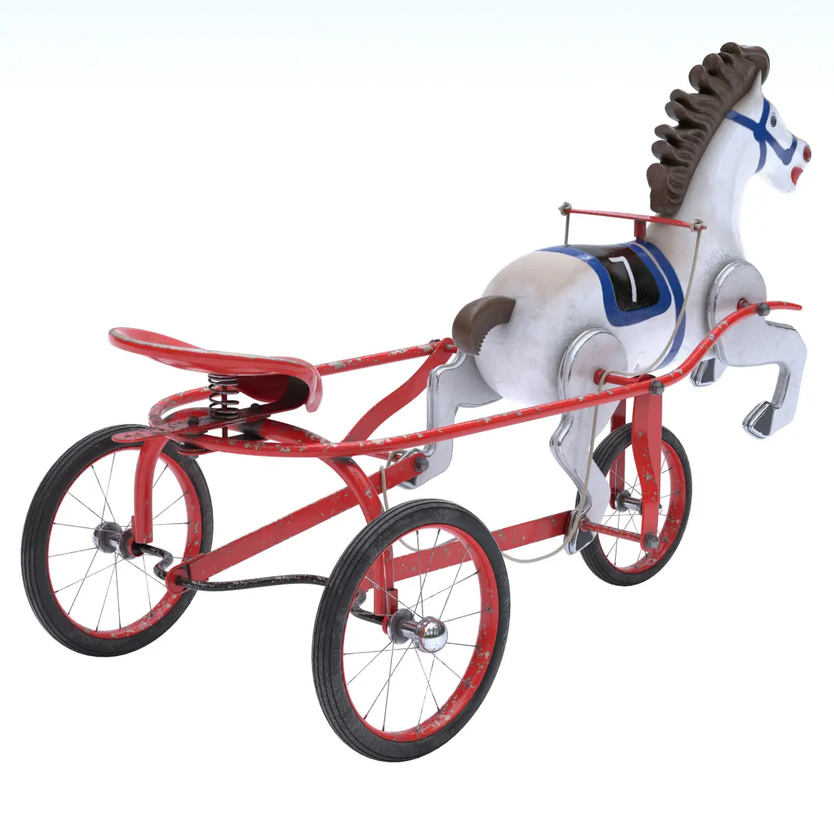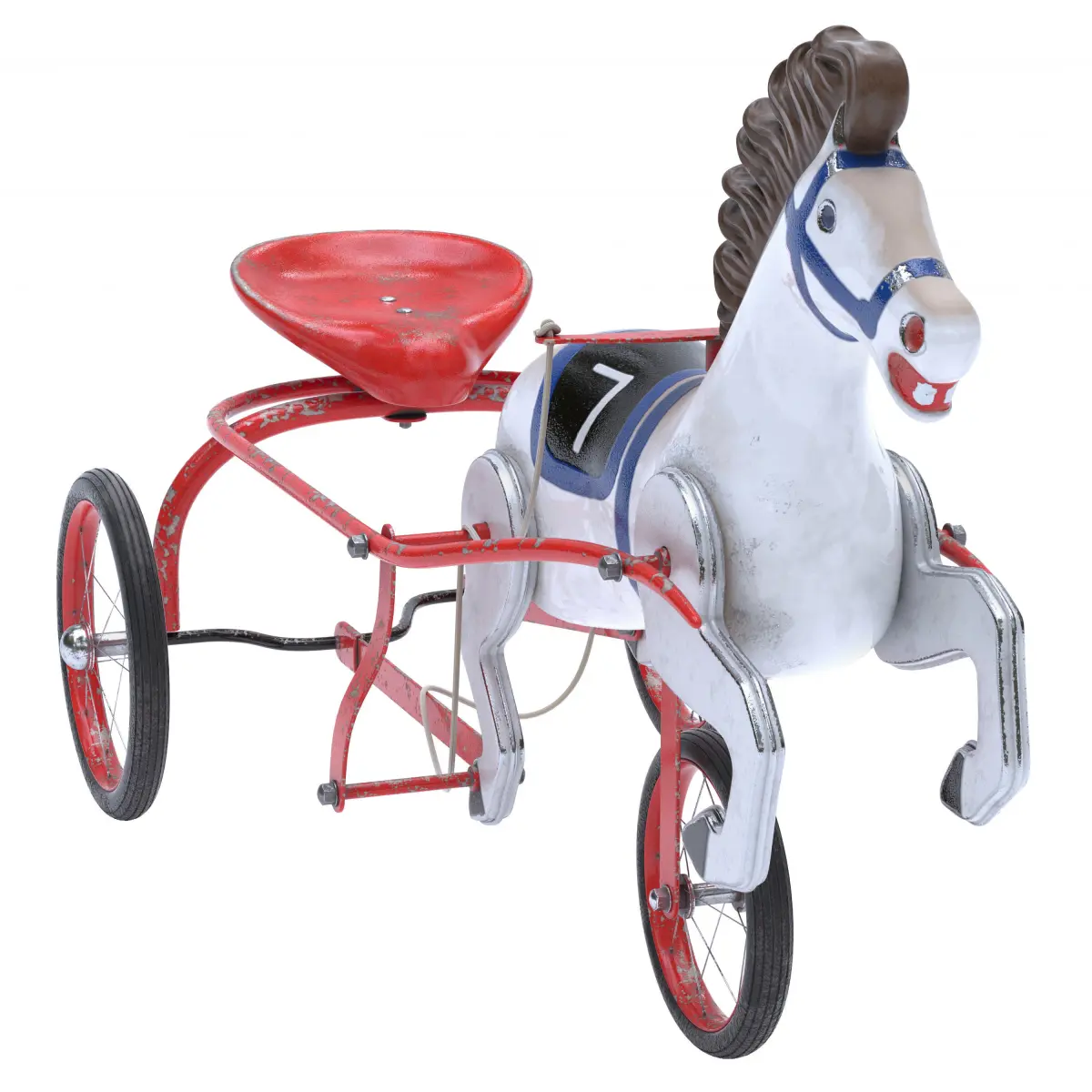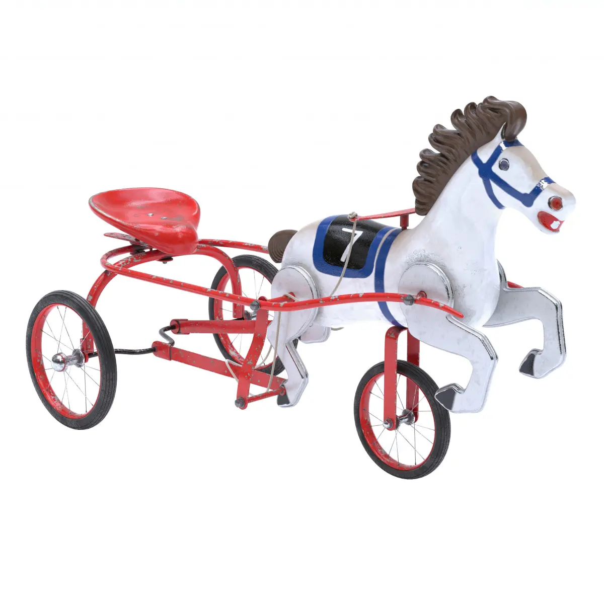 Vintage Soviet Horse Tricycle Pedal CarMid-Century horse and sulky pedal car, child's ride on sulky horse toy with number seven.Vintage Soviet, USSR metal tricycle toy, pedal toy with manes and tail in rubber.Highly realistic and detailed 3D model.