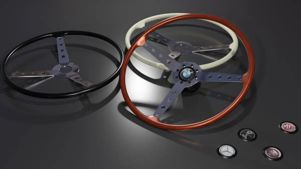 Hi, this is a simple 3D model of an old style sport steering wheel. By default it comes with a wooden wheel but it's fairly easy to change it to ivory or black . Included are other car brand logos. NOTE : for *.obj and *.fbx users : you'll have to change the transmission value of the transparent part on the center ring if you want to see the logos!