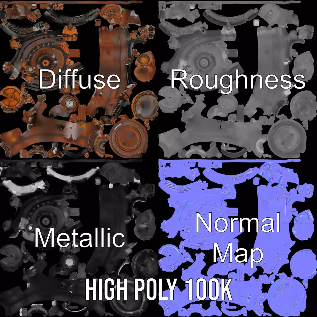 This detailed Vintage Steampunk Boiler model pack brings industrial charm and an authentic steampunk aesthetic to your projects. Each model has 3 levels of detail: low-poly (1000 triangles for mobile), middle-poly (10,000 triangles for the environment), and high-poly (100,000 triangles), which allows for the use of this model in production rendering (such as 3ds Max, Maya, Cinema4D, Blender, Vray/Corona/Cycles and all others), game engines (Unity and Unreal compatible), and interactive presentations, providing a choice of detail based on the LOD System principle. Ideal for use in steampunk-themed games, animations, or visualizations. The model's textures are PBR, Diffuse, NormalMap, and reflection/roughness/metallic, suitable for any modern rendering engine. All models accurately unwrapped with no overlapping UV. Textures are 4096*4096 in size. The first image is the reference used for creating the 3D model. It is important to carefully evaluate the quality of the model by examining the preview images that display the topology and polygonal mesh. These previews (WIRE and WEB 3D Preview) clearly demonstrate how accurately the model matches the original reference and how well the geometry has been executed. Please like and leave a comment if you enjoyed the model.