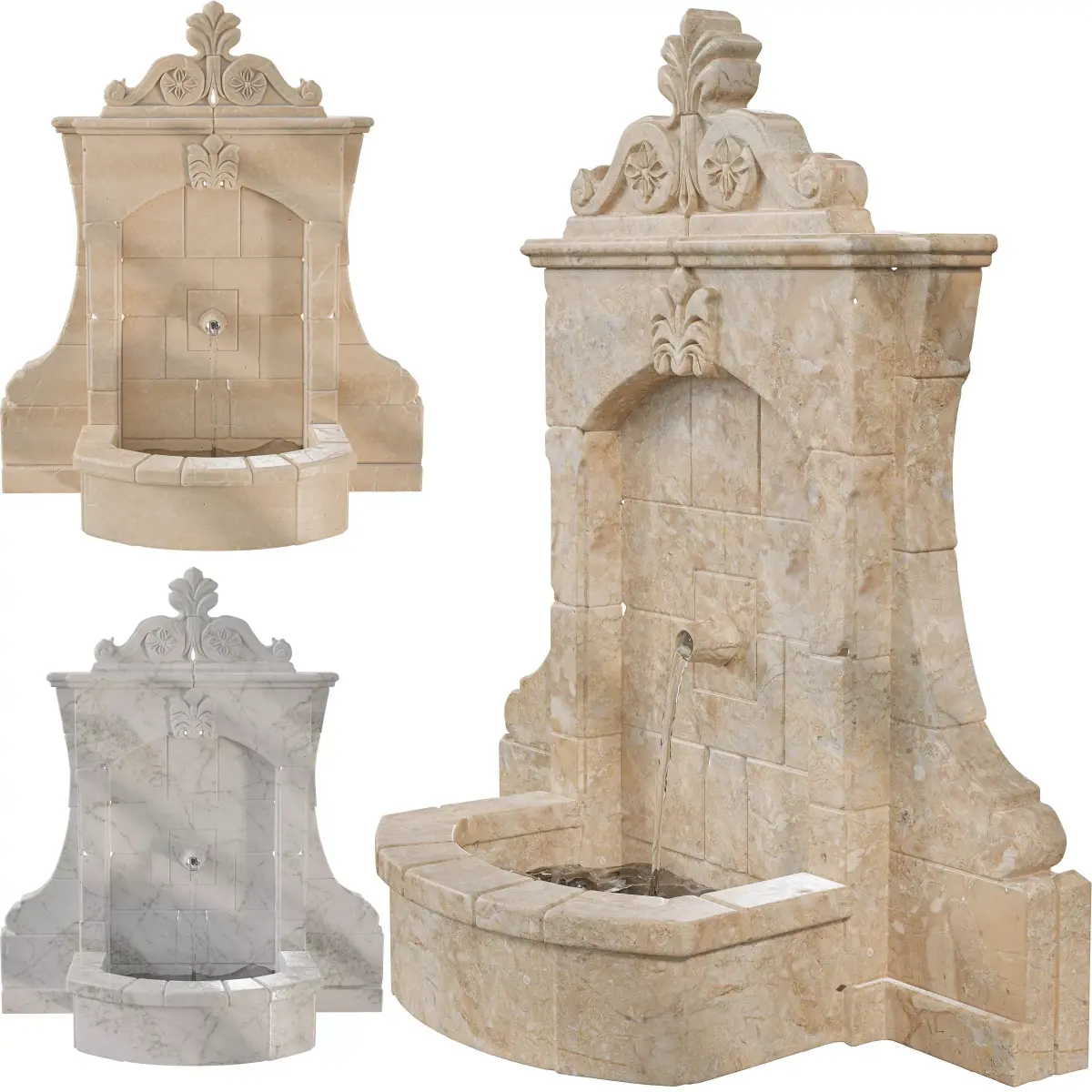 Name: Vintage Stone Wall Fountain Classical ReliefType: modelFormat: 3Ds Max 2013Export: FBX, OBJRender: VRay (5.x), Corona (6)Polys: 97425Verts: 51556Matclasses: VRayMtl,CoronaMtlUnits: CentimetersDimension: 91.84 x 37.19 x 85.54Date: 2025.11.16This detailed 3D model features a vintage wall-mounted stone fountain crafted from weathered blocks and adorned with ornate classical motifs. At its center is a protruding spout set into a square panel, topped by a decorative floral relief. The fountain’s crest includes scrollwork and carved floral elements, adding architectural richness. A semi-circular basin at the base collects water, completing the design with symmetry and elegance.