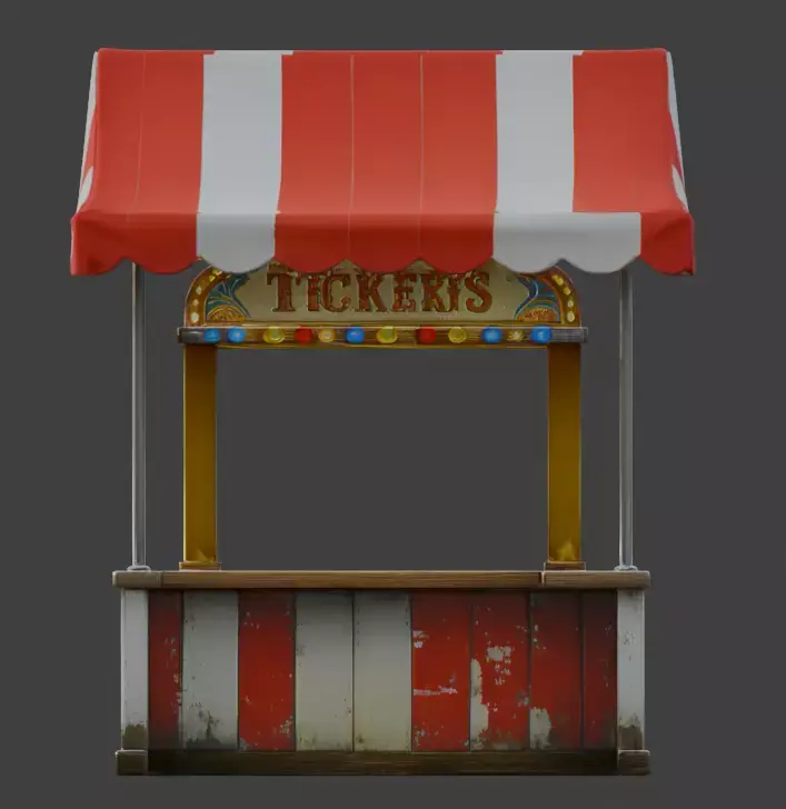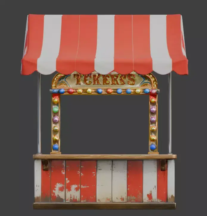 TagsTicketBooth, Circus, Carnival, 3DModel, Retro, Vintage, RedAndWhite, StripedCanopy, Fairground, GameAsset, Realistic, PBR, Weathered, WoodenCounter, Nostalgic, AmusementPark, DecorativeLights, HistoricalProp, Stylized, EnvironmentProp