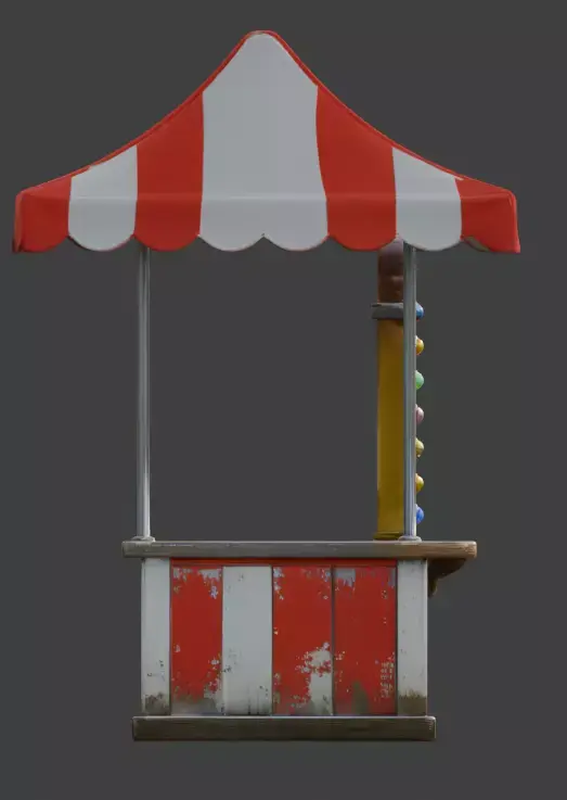 DescriptionThis is a highly detailed 3D model of a retro circus ticket booth, featuring a classic red and white striped fabric canopy and a weathered wooden counter. The structure is characterized by a distressed paint finish on the vertical wood panels, showcasing realistic peeling and environmental wear. A prominent TICKETS sign is framed with vibrant, multicolored decorative light bulbs that add a nostalgic carnival atmosphere. Supported by thin metal pillars, this asset captures the whimsical yet aged aesthetic of a traditional traveling circus, making it an ideal environmental prop for historical fairground scenes, amusement park levels, or stylized cinematic renders.