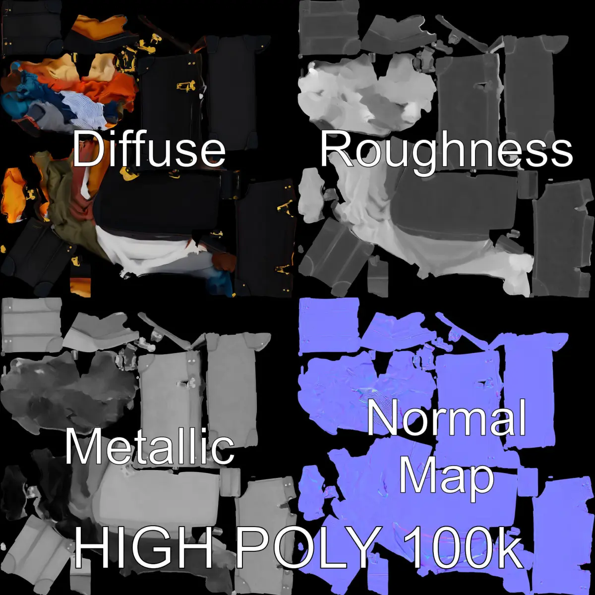 The model features PBR textures, including Diffuse, NormalMap, and reflection/roughness/metallic maps, ensuring compatibility with modern rendering engines. Textures are sized at 4096x4096, and the models are accurately unwrapped with no overlapping UVs.