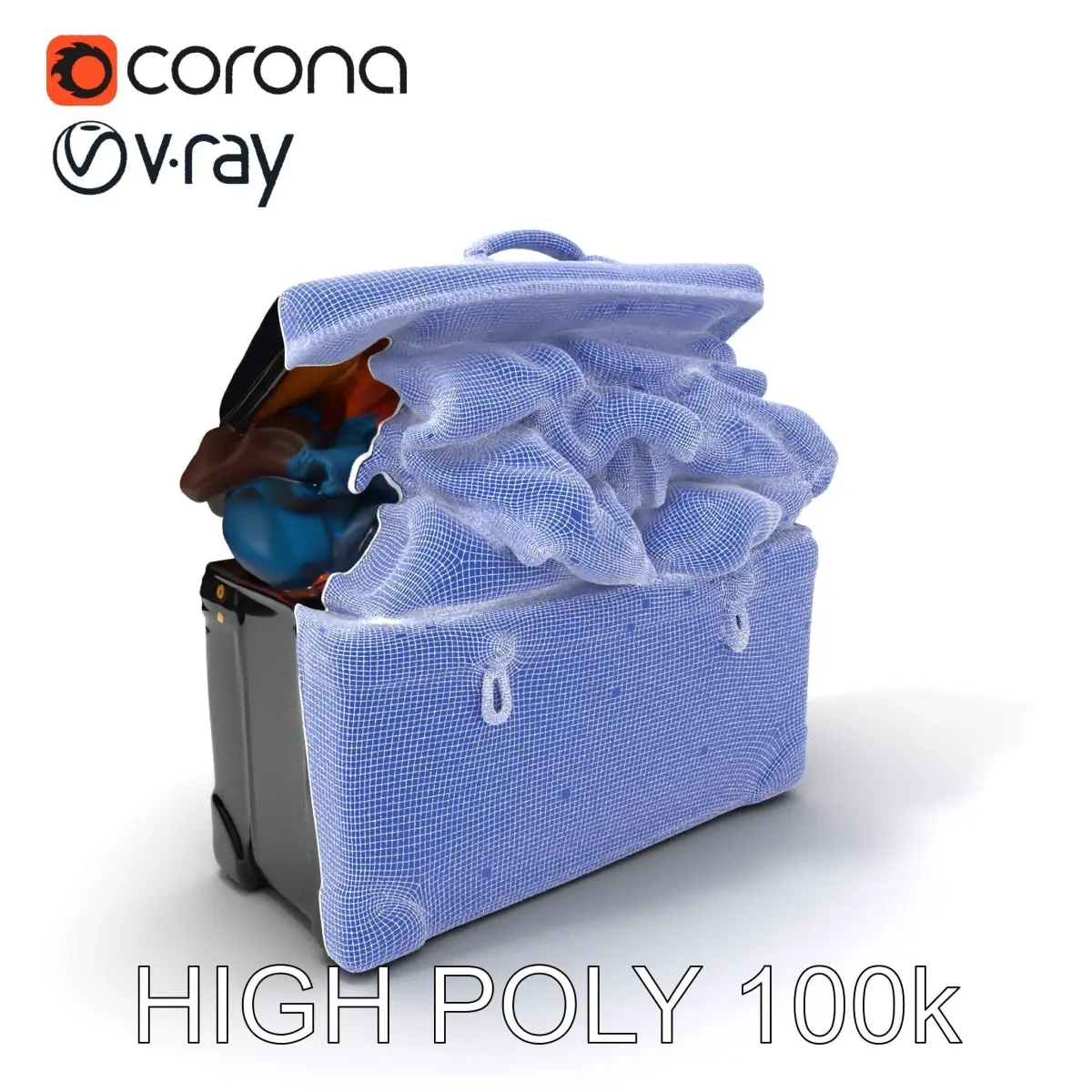 This vintage suitcase with various clothes model pack offers three levels of detail: low-poly (1000 triangles for mobile), middle-poly (10,000 triangles for environment), and high-poly (100,000 triangles). Ideal for production rendering in 3ds Max, Maya, Cinema 4D, Blender, game engines like Unity and Unreal, and interactive presentations.