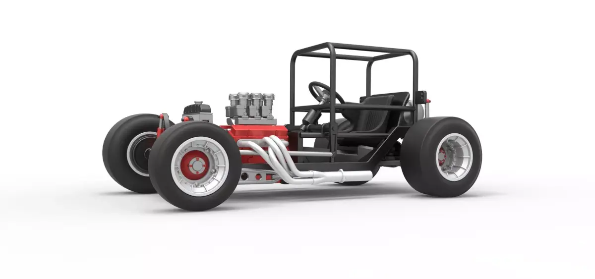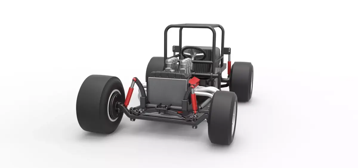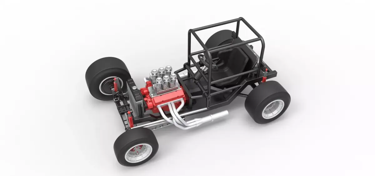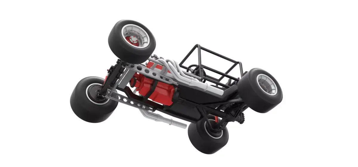 The model consists of parts: Air intake, Engine, Frame, Front left hub, Front left rim, Front left tire, Front right hub, Front right rim, Front right tire, Left exhaust, Radiator, Rear left hub, Rear left rim, Rear left tire, Rear right hub, Rear right rim, Rear right tire, Right exhaust, Seat, Shifter, Steering wheel, Tank.