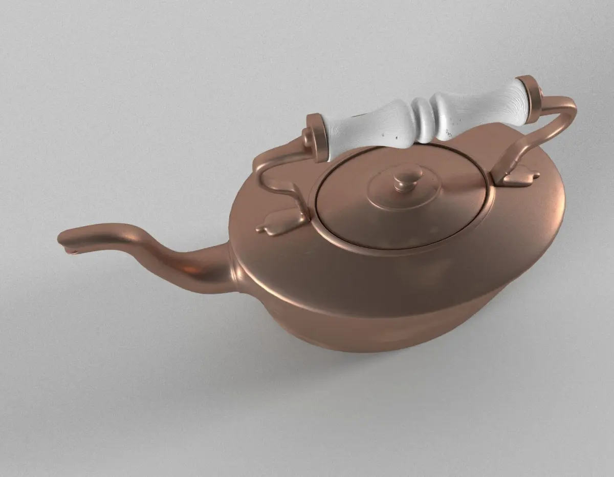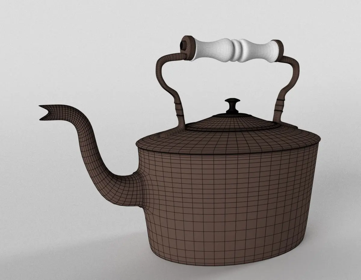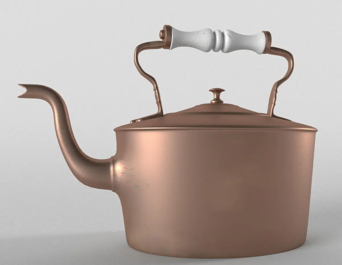 Oval vintage tea kettle with little signs of usage like blotches and stress marks effecting the metal.