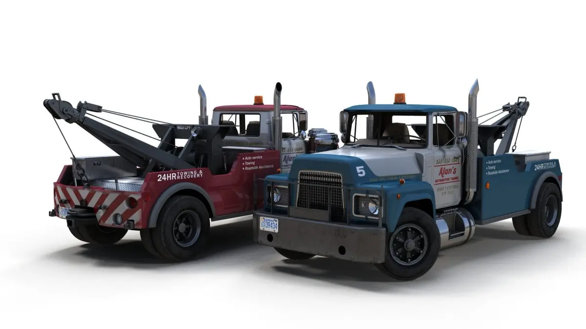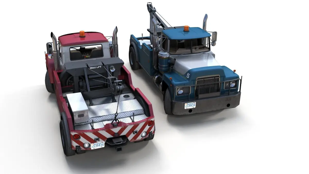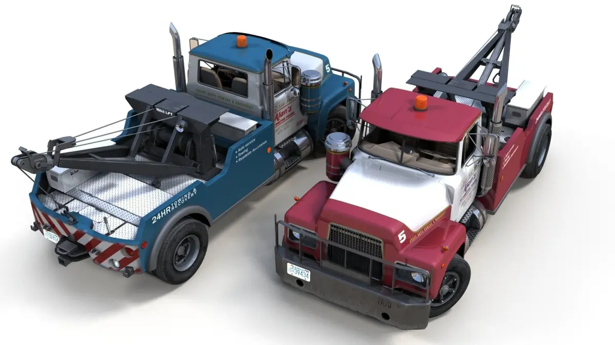 High accuracy vintage tow truck gameready model. Midpoly exterior. Lowpoly interior(1024x1024 diffuse texture). Low poly wheels with PBR textures(2048x2048).Archive include 3 paint schemes forbody( red,black,blue).