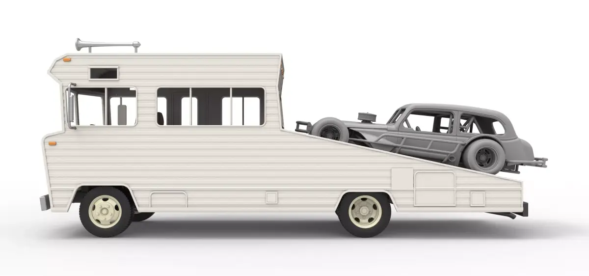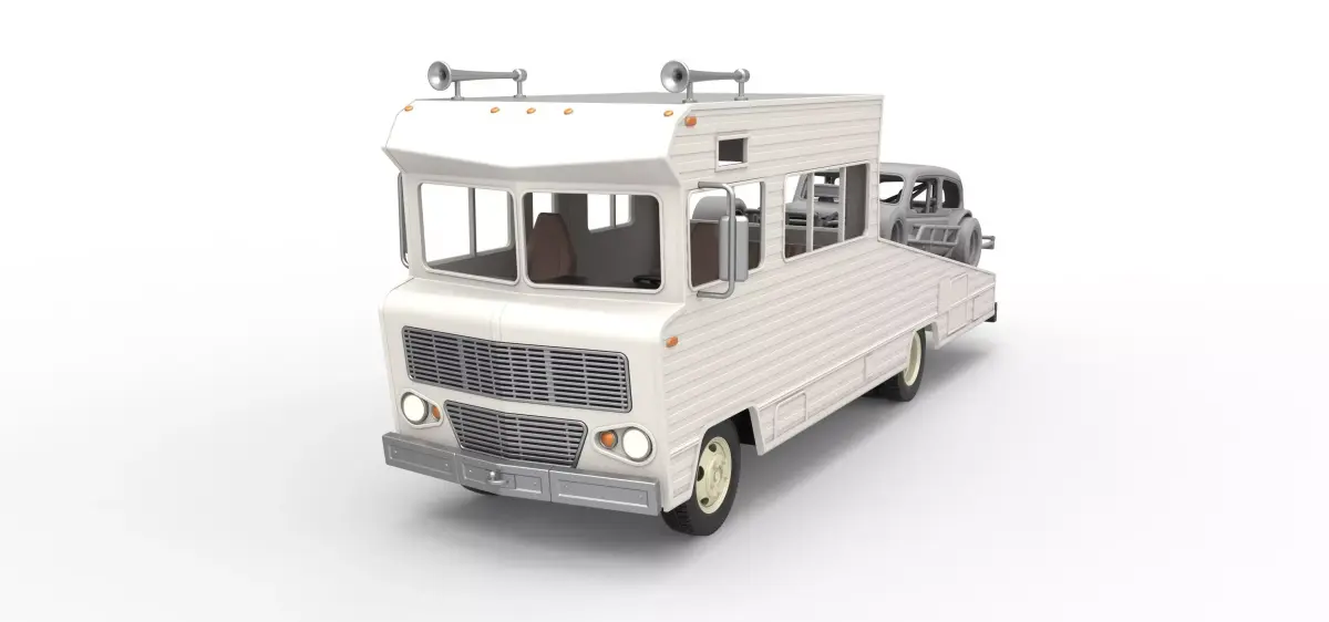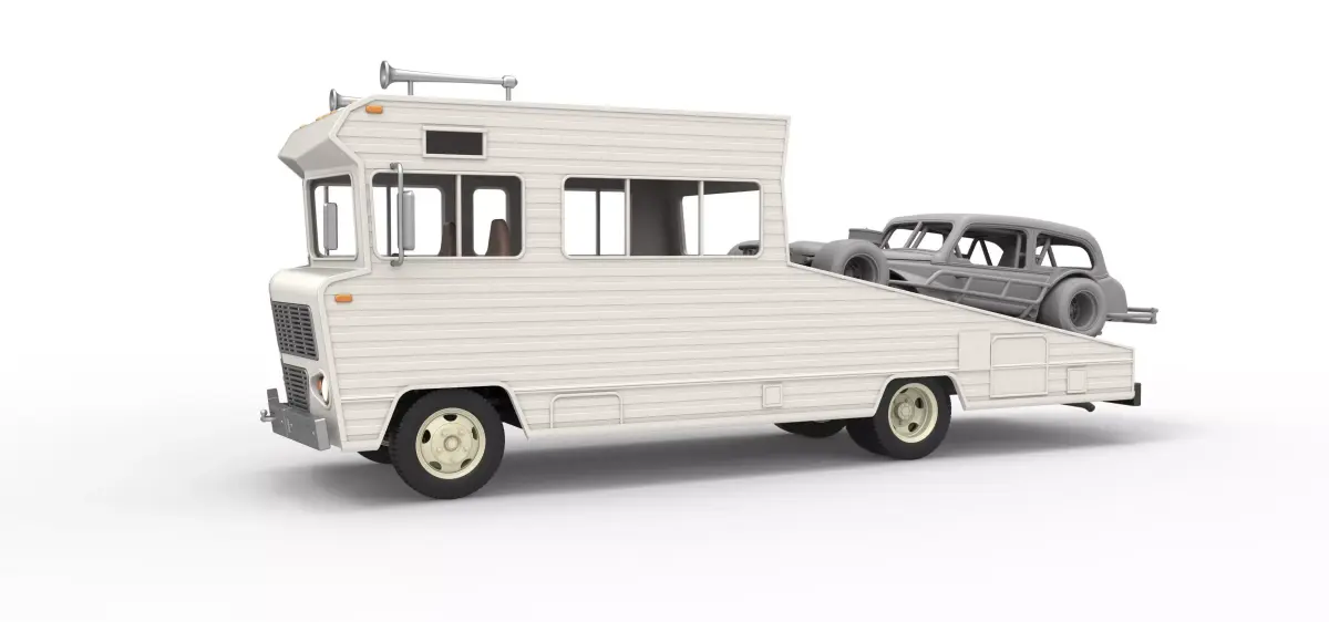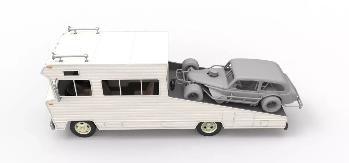 The model consists of parts: Air filter cap, Air filter, Engine, Frame part 1,2, Front bumper, Front grid 1,2, Front rims, Front seats, Headlights, Hood, Horns, Left exhaust, Left mirror, Radiator, Rear bumper, Rear inner rims, Rear outer rims, Rear seats, Right exhaust, Right mirror, Shell part 1,2, Steering wheel, Tank, Tires, Turn signal lights, Winch.
