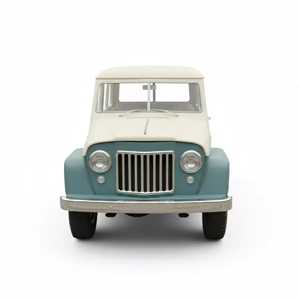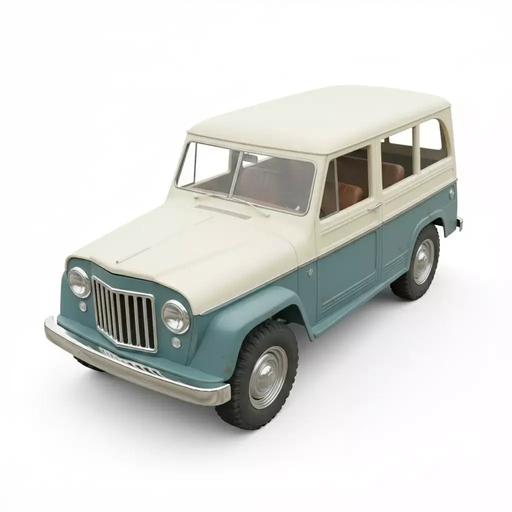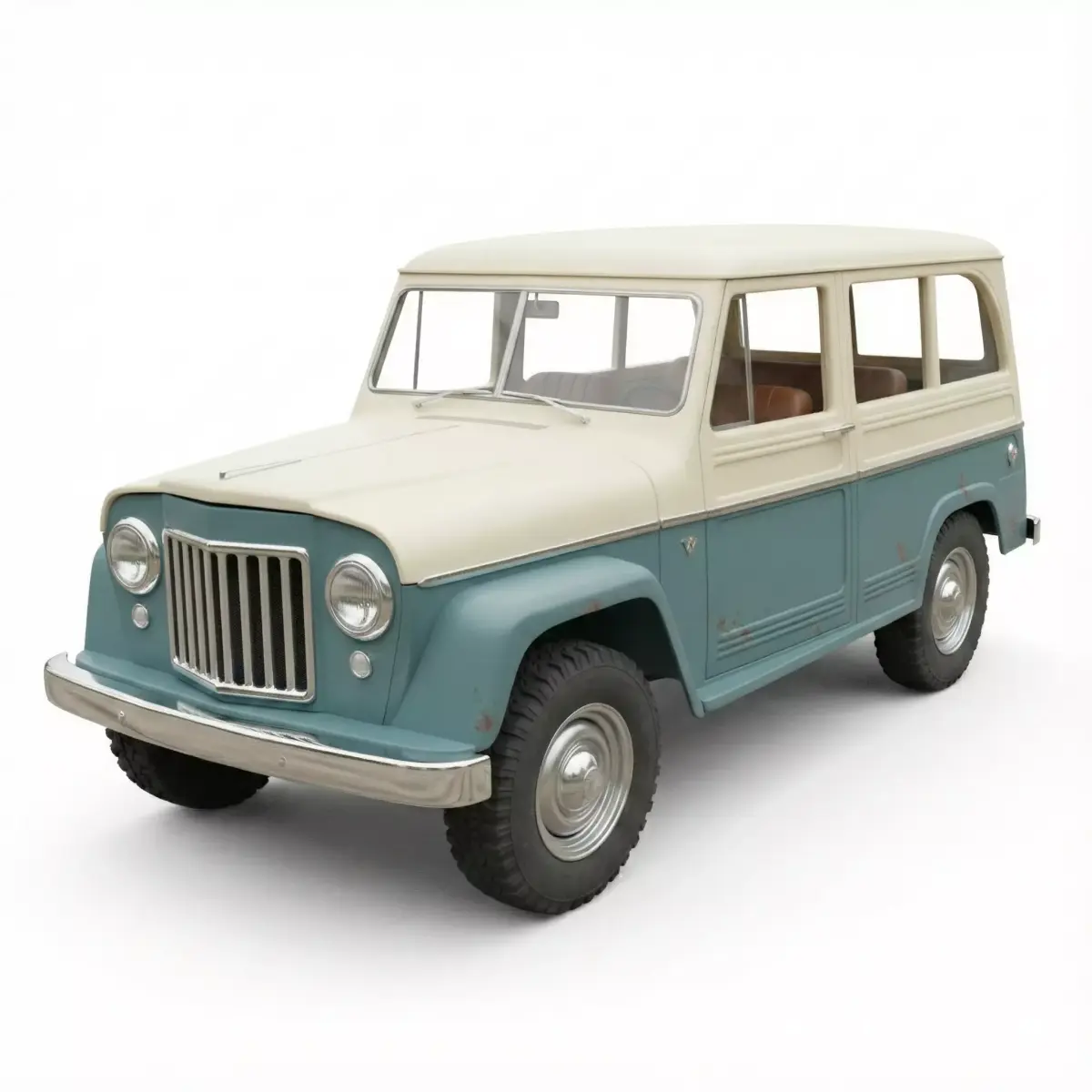 This is a high-quality 3D model of a classic, vintage utility wagon from the mid-20th century, reminiscent of the iconic Willys-Overland Station Wagon. The model features a distinctive two-tone paint scheme, with the main body in a patina-style teal/blue-green and the roof and hood in a cream/off-white. Details include a vertical-slat grille, prominent round headlamps, and chrome bumper accents. The model is presented with subtle signs of wear and rustic texturing, giving it an authentic, historical feel. This asset is perfect for scenes requiring a nostalgic family vehicle or an old-school off-road look in a game, visualization, or animated project.