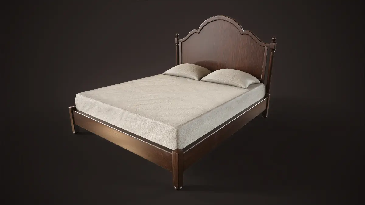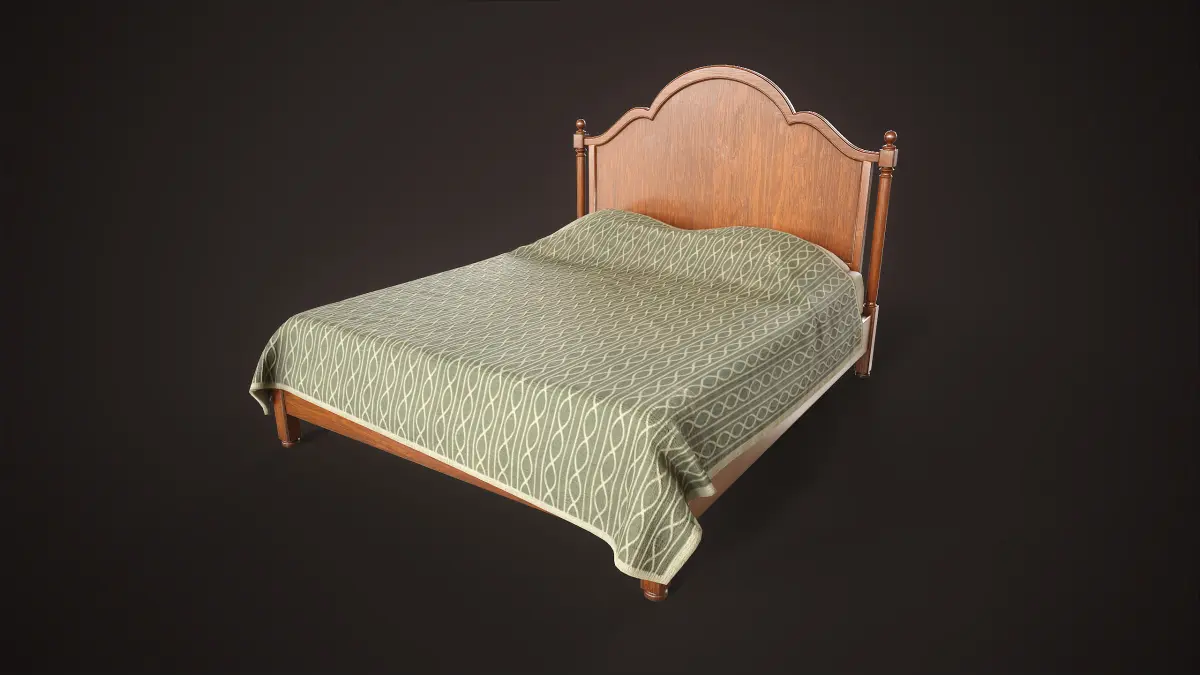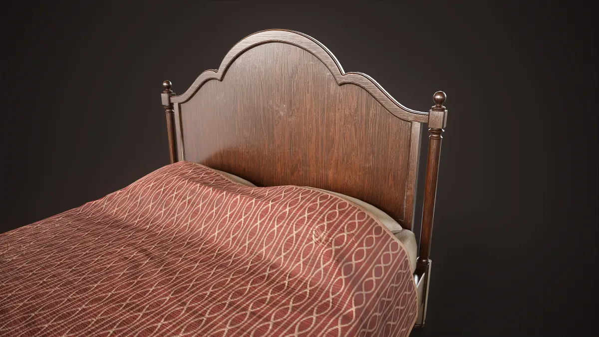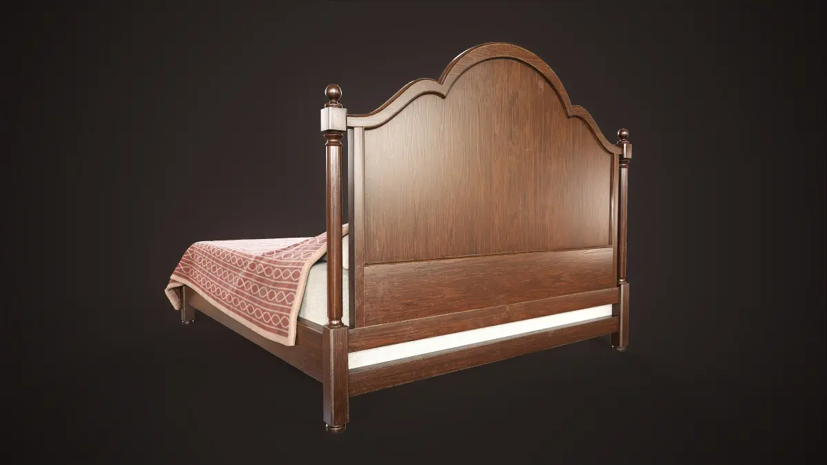 A detailed vintage bed featuring a classic wooden design with two wood finishes (dark and light) and two blanket colors (red and green).