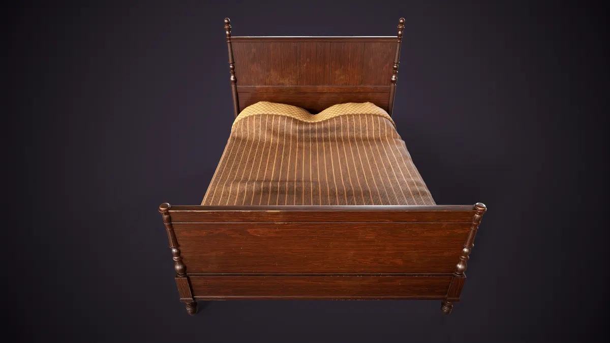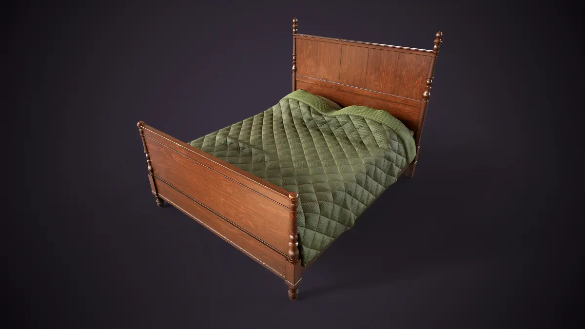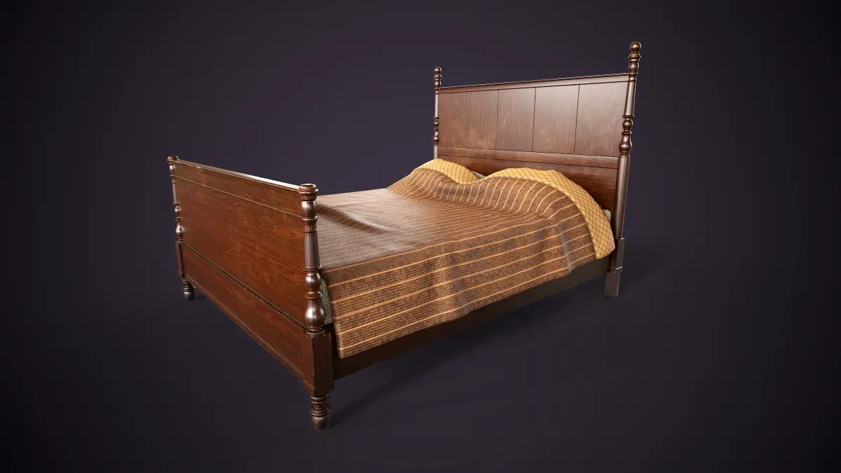 This model features a classic bed frame with ornate carved details, suitable for various interior settings.