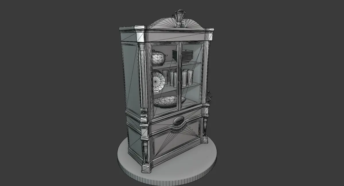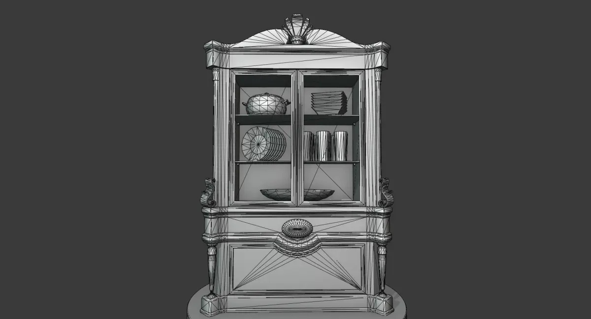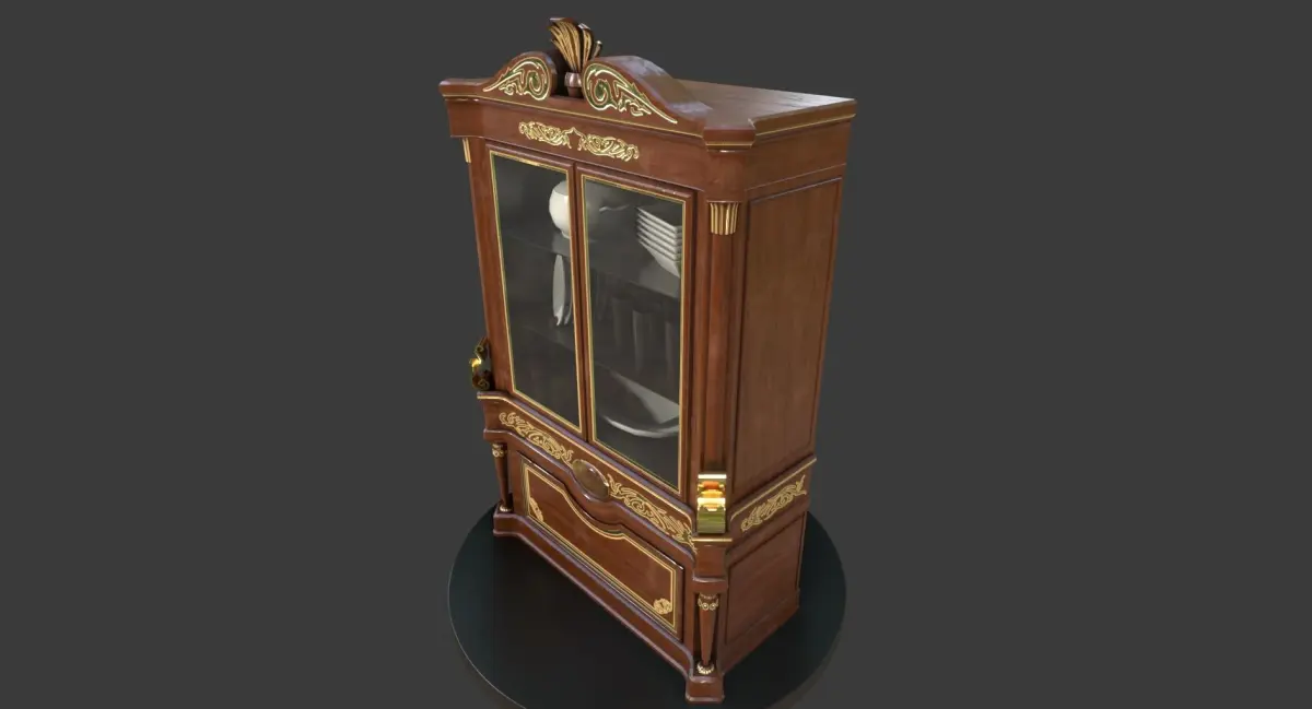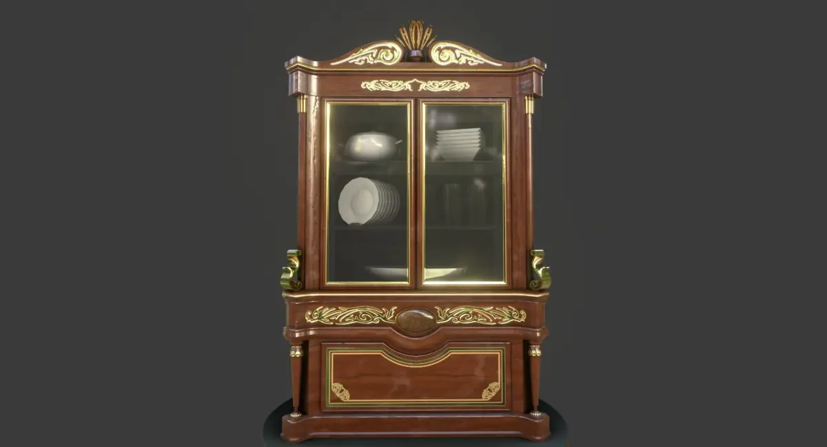This is a model of a vintage-looking cabinet with wooden body, a few porcelain dishes behind the glass and some golden ornaments / details. It is a part of a larger set of similar furniture in this style.