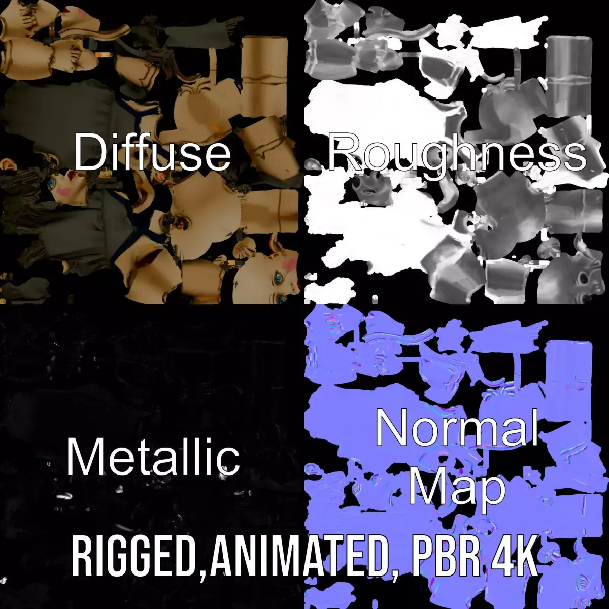 The Vintage Wooden Doll model pack features a meticulously crafted 3D model of an antique-style doll, bringing a touch of nostalgia to your project. Ideal for game development, film production, or interactive storytelling, it adds character and charm with its detailed features. Each model has 3 levels of detail: low-poly (1000 triangles for mobile), middle-poly (10,000 triangles for environment), and high-poly (100,000 triangles), which allows for the use of this model in production rendering (such as 3ds Max, Maya, Cinema4D, Blender, Vray/Corona/Cycles, and all others), game engines (Unity and Unreal compatible), and interactive presentations, providing a choice of detail based on the LOD System principle. The model's textures are PBR, Diffuse, NormalMap, and reflection/roughness/metallic, suitable for any modern rendering engine. All models are accurately unwrapped with no overlapping UVs. All textures are 4096*4096 in size.