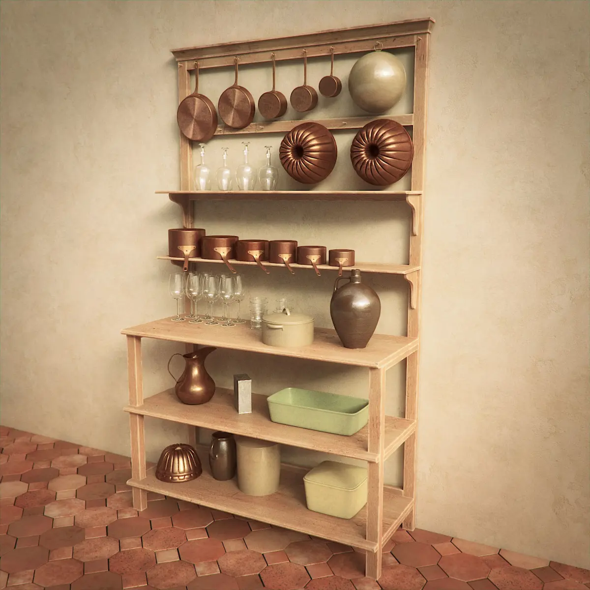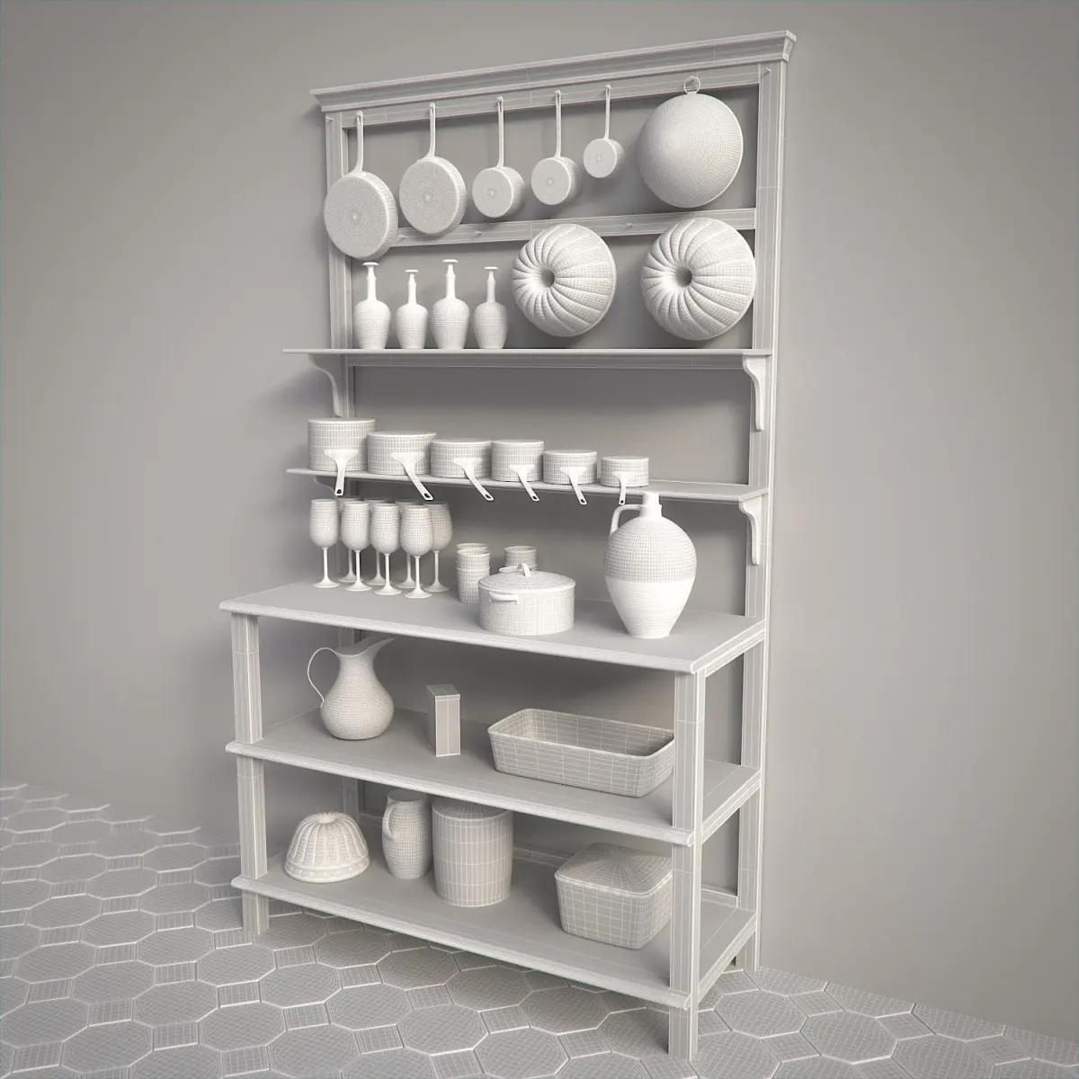 This vintage wooden Kitchen Shelf is a high quality model that will enhance detail and realism of any of your rendering projects. The table, the floor and all other elements have a fully textured, detailed design that allows for close-up renders.