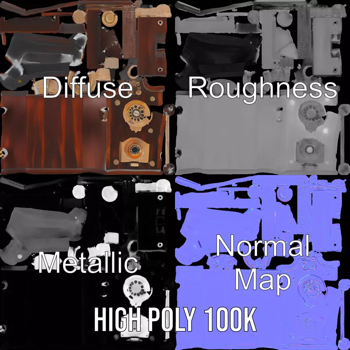 This vintage wooden telephone model pack offers a beautifully crafted antique-style telephone, ideal for historical reconstructions, period films, and vintage-inspired scenes. Each model has 3 levels of detail: low-poly (1000 triangles for mobile), middle-poly (10,000 triangles for environment), and high-poly (100,000 triangles), which allows for the use of this model in production rendering (such as 3ds Max, Maya, Cinema4D, Blender, Vray/Corona/Cycles and all others), game engines (Unity and Unreal compatible), and interactive presentations, providing a choice of detail based on the LOD System principle. The model's textures are PBR, Diffuse, NormalMap, and reflection/roughness/metallic, which are suitable for any modern rendering engine. All models are accurately unwrapped and have no overlapping UV. All textures are 4096*4096 in size. If you like the model, please leave a like and comment.