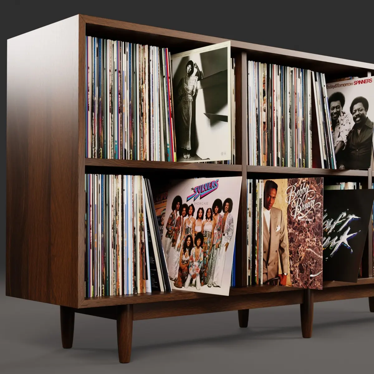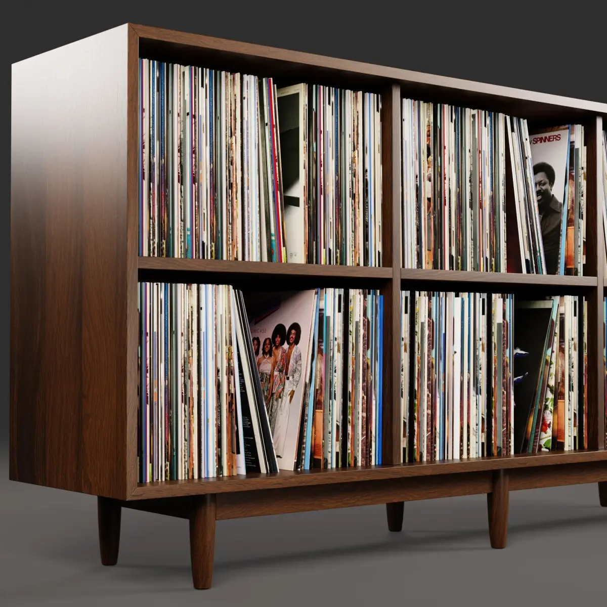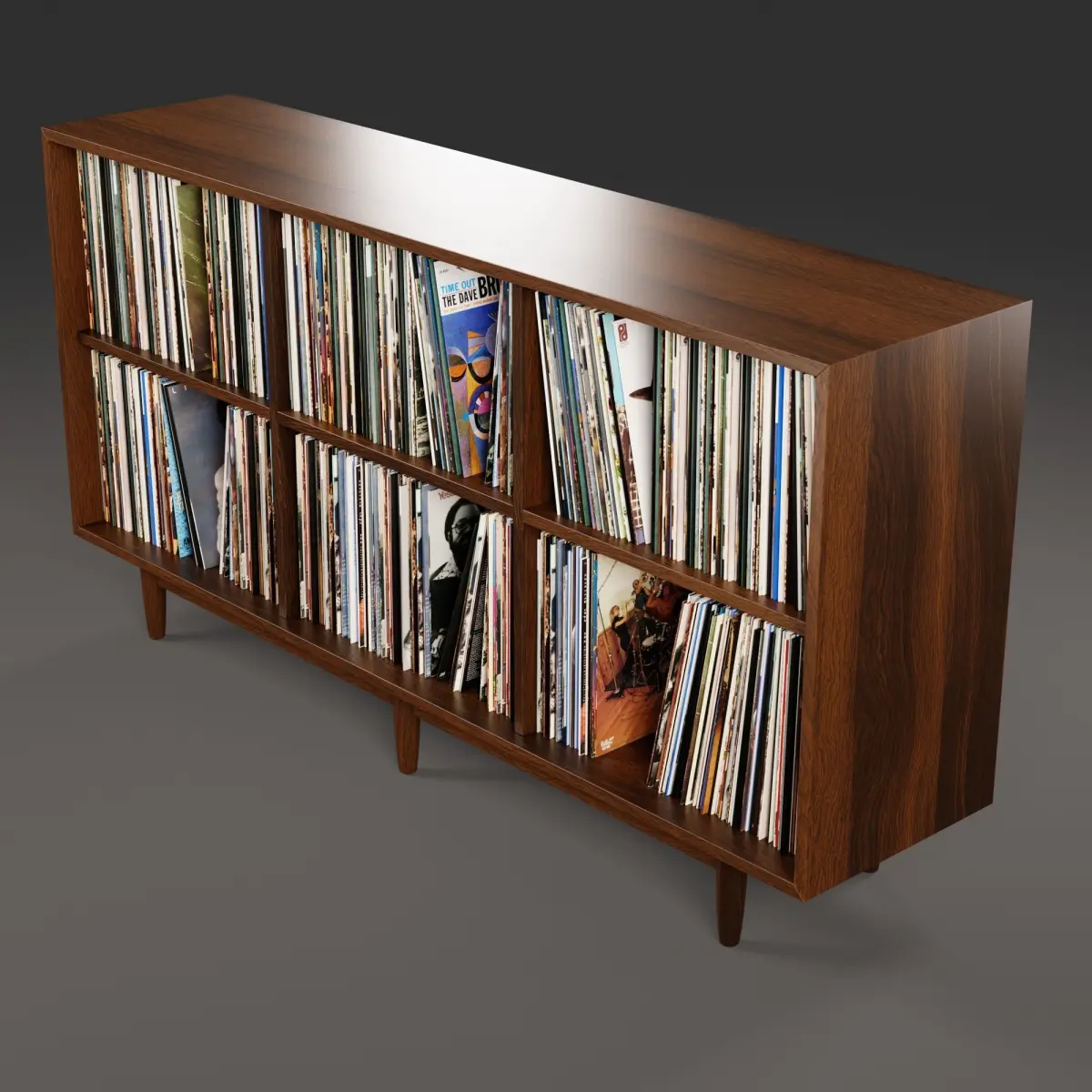 Realistic 3D model of a vinyl LP storages with hundreds of vinyls. The model is suitable for any visual production - broadcast, advertising, design visualization, etc