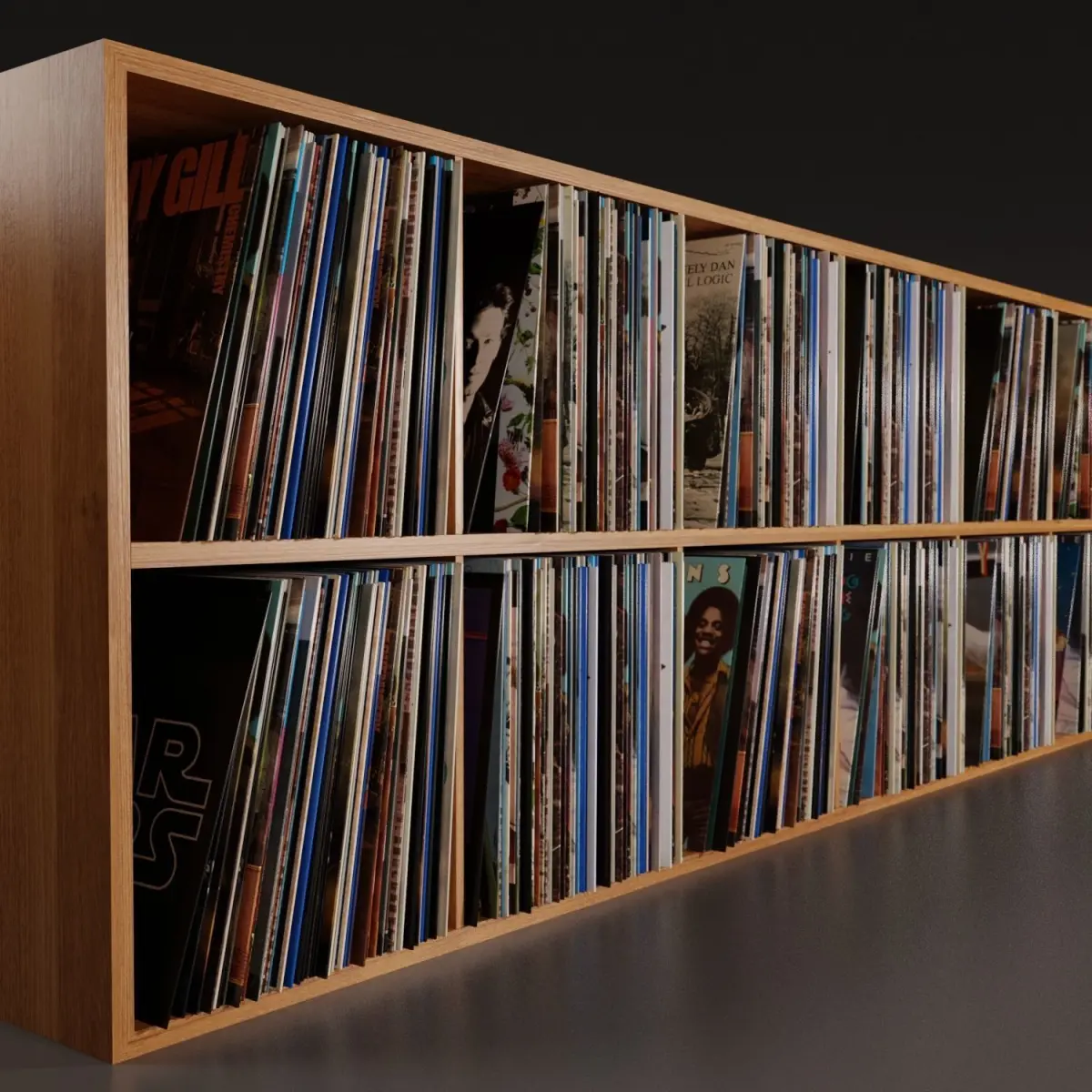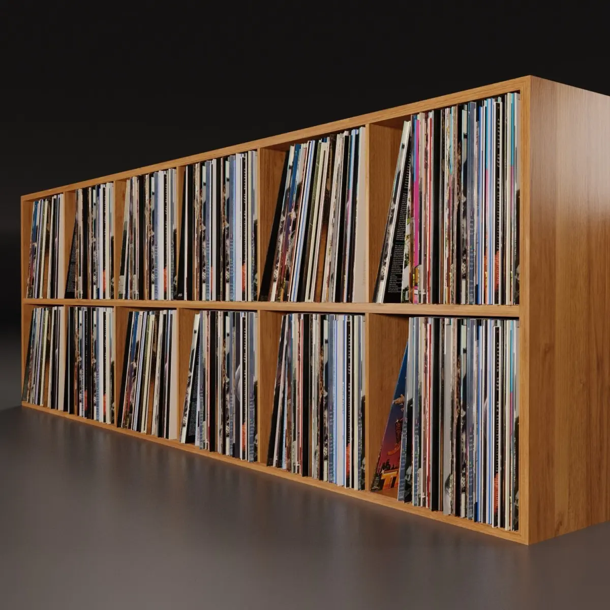 Realistic 3D model of a vinyl LP storage with hundreds of vinyls. The model is suitable for any visual production - broadcast, advertising, design visualization, etc