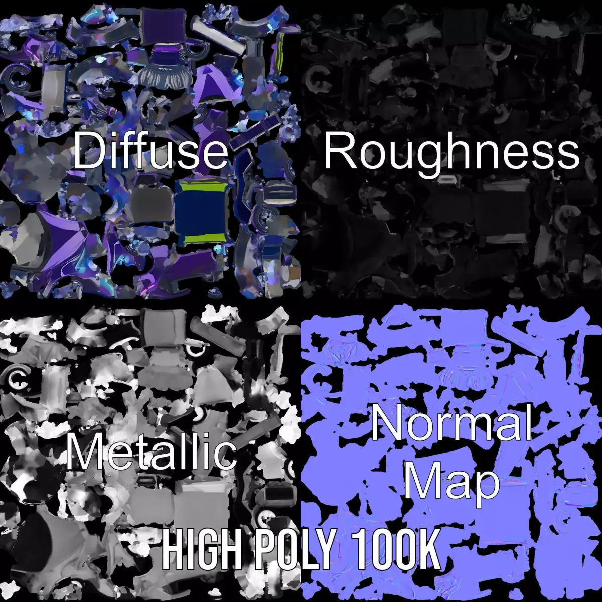 The textures are PBR-compatible, including diffuse, normal map, reflection, roughness, and metallic maps, suited for any modern rendering engine. All models are accurately unwrapped with no overlapping UVs.