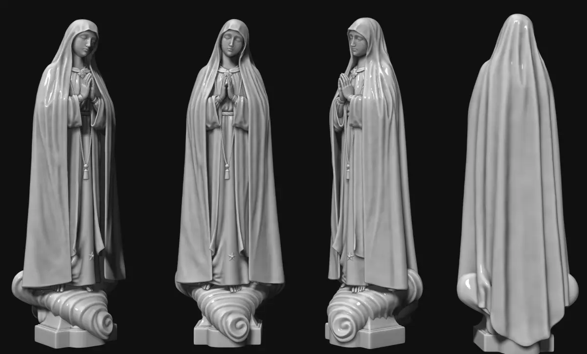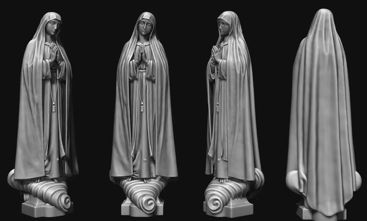 Five models are included (Stl, Obj and Vrml) Fatima, Fatima (No flowers), Fatima (No cloud), Fatima (No cloud, no flowers) and Crown, It can be printed and carved.