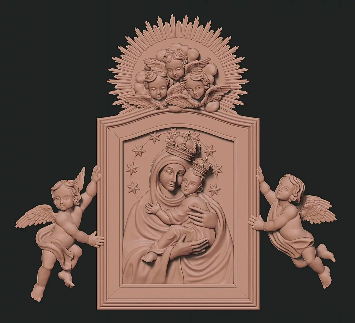 Relief of Virgin Mary and Jesus with Cherubs, can be used in projects of Masonry, Carpentry, Jewelry. Model for 3D printing and Carving on CNC Machines or similar methods