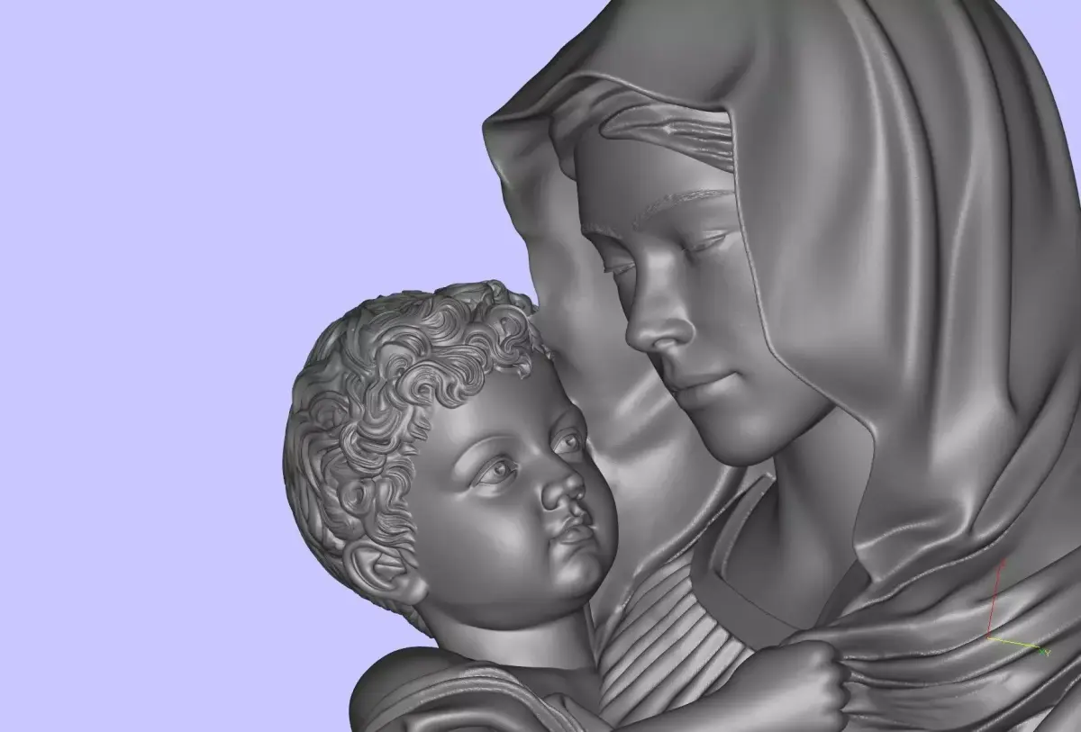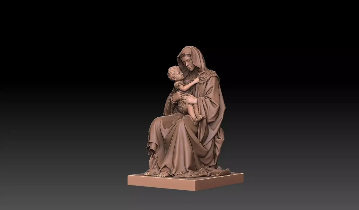 A stunning, fully 3D sculpted statue of the Virgin Mary holding the Child Jesus (Madonna and Child). The composition captures a tender, spiritual moment with exceptional realism. Mary is depicted seated, wearing heavily draped robes that flow naturally, while the Christ Child sits securely in her arms, looking up at her with affection.The model features intricate details in the curly hair of the Child, the serene facial expressions, and the deep, realistic folds of the fabric. It is a masterpiece of digital sculpting, bringing classical religious art to the modern 3D printing era.Technical Specifications: