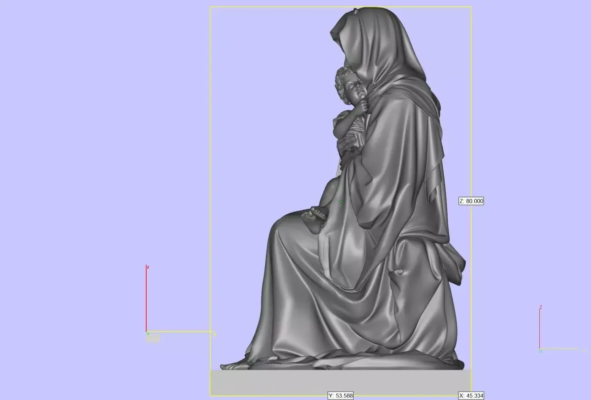 Optimization: The model is optimized for 3D Printing (SLA/DLP Resin and high-quality FDM) but is also suitable for CNC machining.File Structure: The product consists of 2 separate Solid Mesh parts for easier printing and assembly:The Main Sculpture (Mary & Jesus).The Rectangular Base.