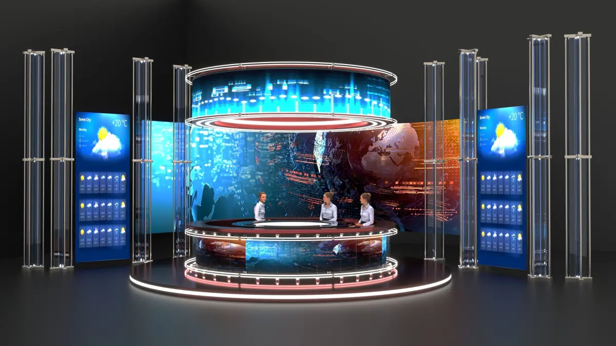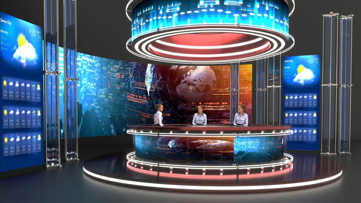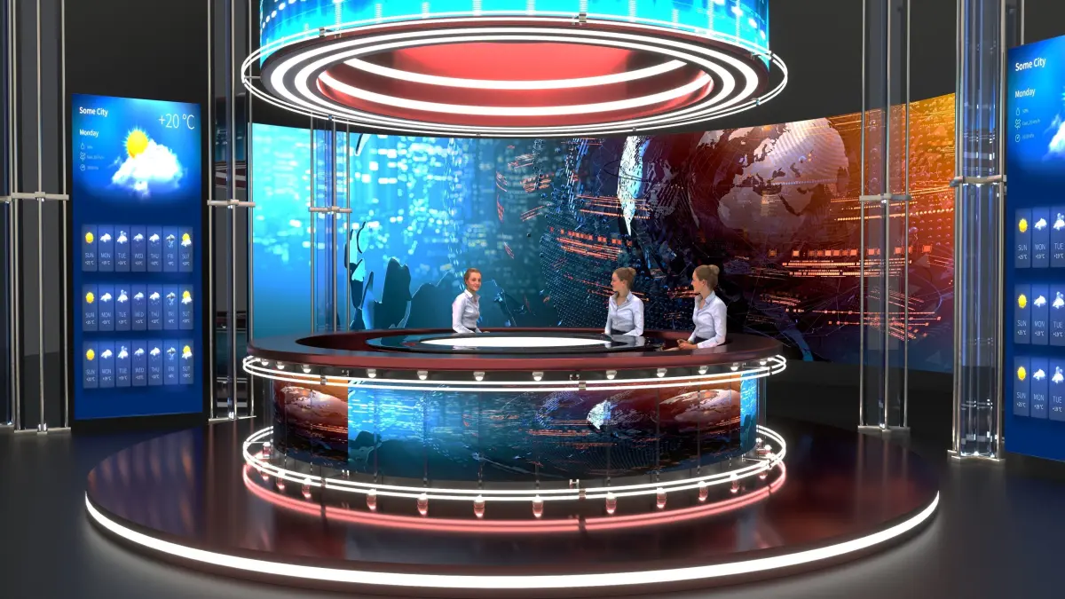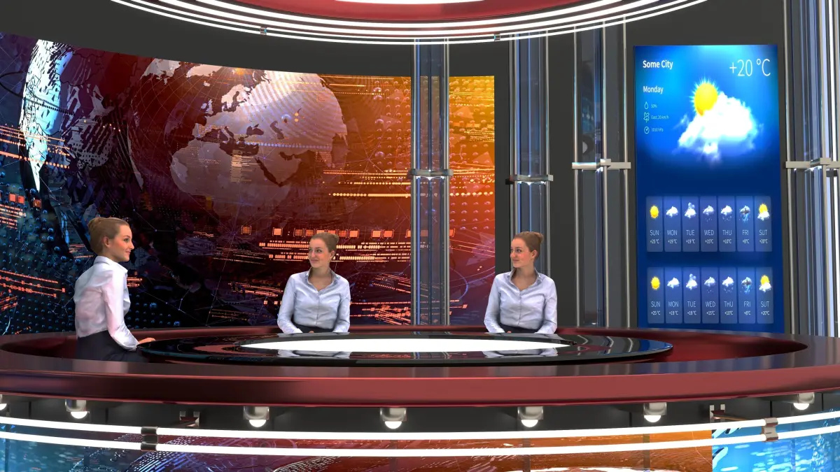 Options for a news channelThe pictures on the monitor were taken from the Internet and were corrected in Photoshop.The model of the girl downloaded for free will not be in the file, it is present on the renderers in order to show you where the presenter is sitting