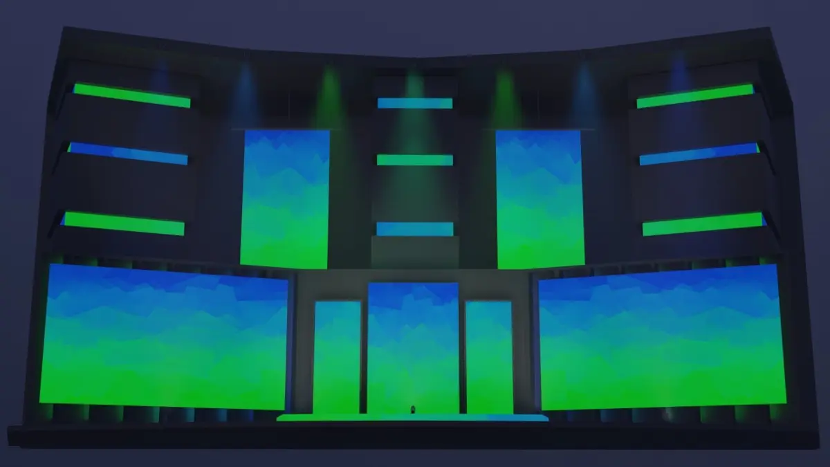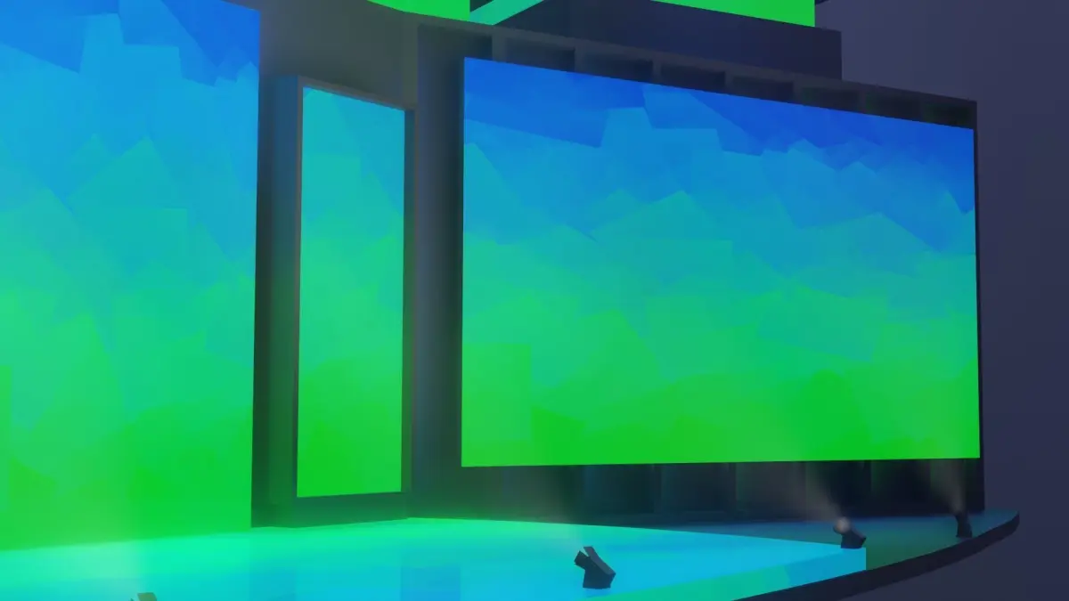 This is a virtual stage design for a presentation virtual event There are 2 sides big screen for the main slide so the presenter doesn't block the main slides.
