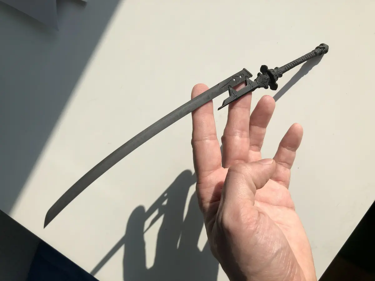 Sword used in the game Nier Automata by the android Type 9 model S, it is the same shape as the Virtuous Treaty used by Type 2 model B , this was modeled in Alias Autostudio and finished in Meshmixer in scale 1/8 for 3d print in my Resin printer Elegoo Mars