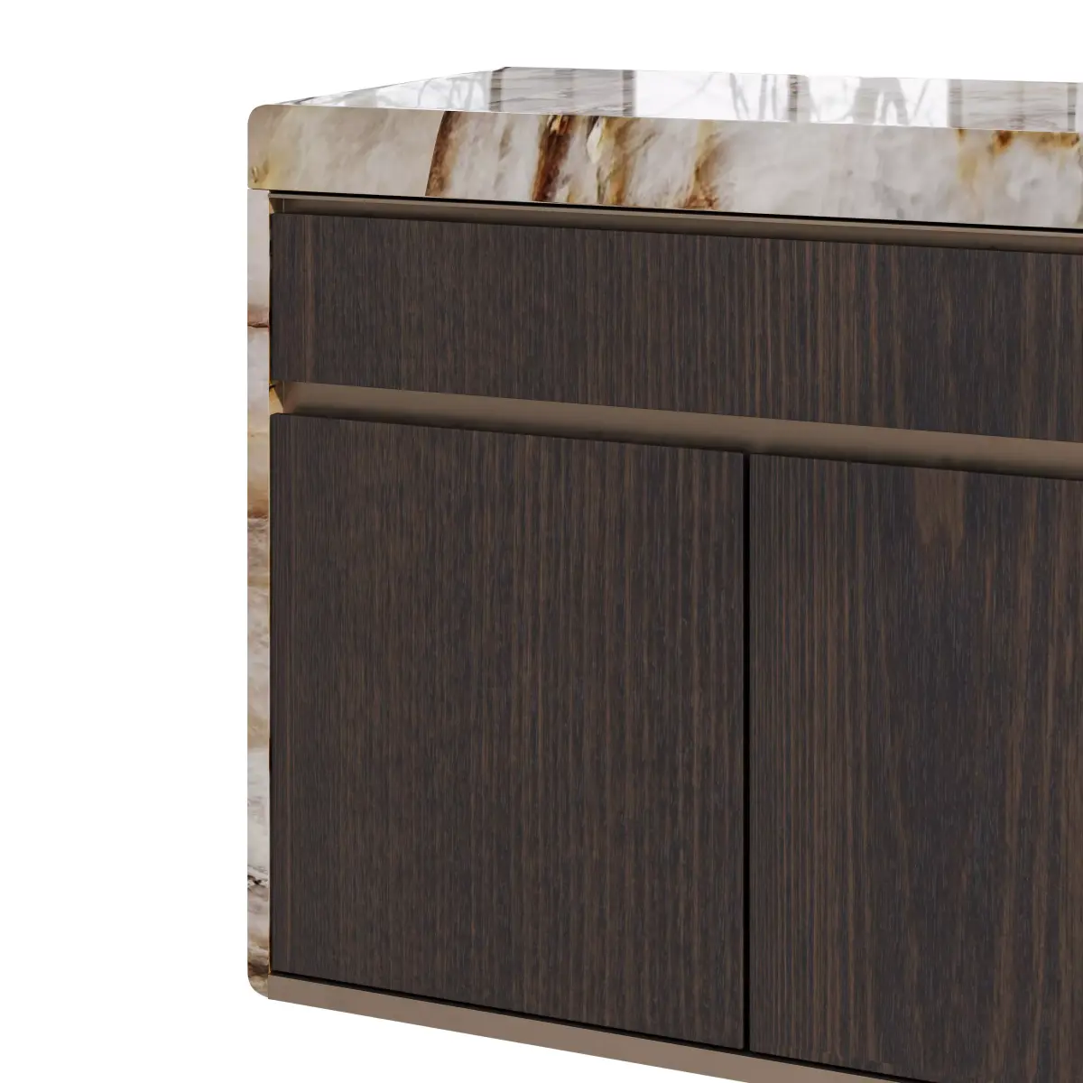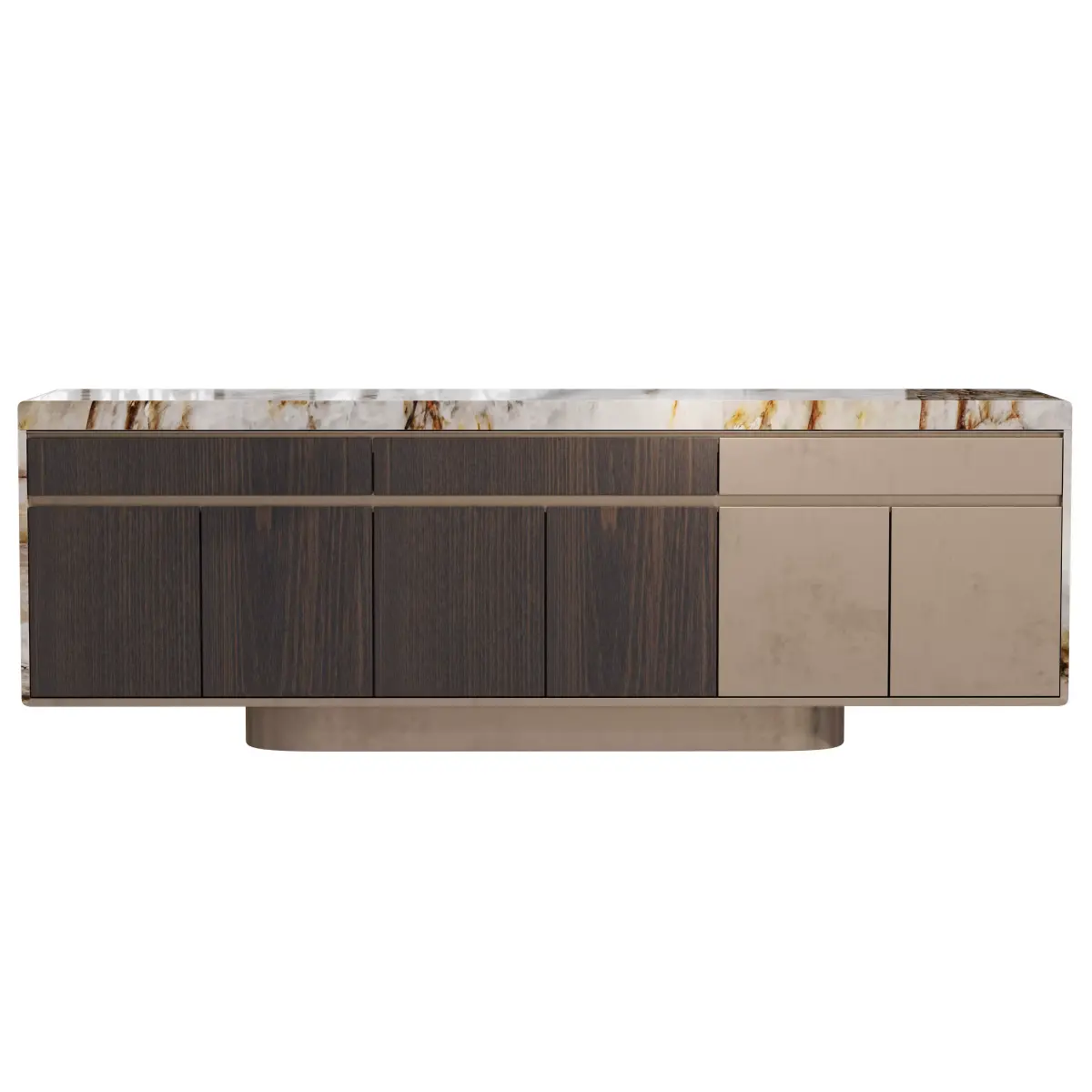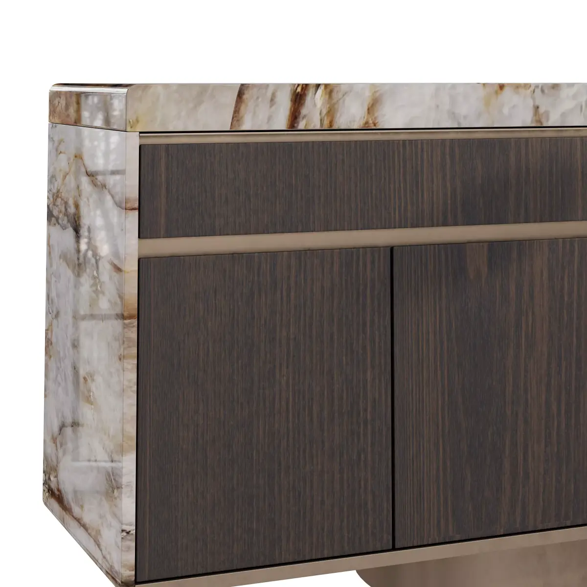 Low cabinet with six doors, featuring boxed marble on the top and sides, and satin steel profiles for door operation. The doors are asymmetrically clad in a mix of matte veneered wood and antique, glossy, or satin metal. Wooden interior includes a glass shelf and matte lacquered or veneered back panel, with optional LED interior lighting.