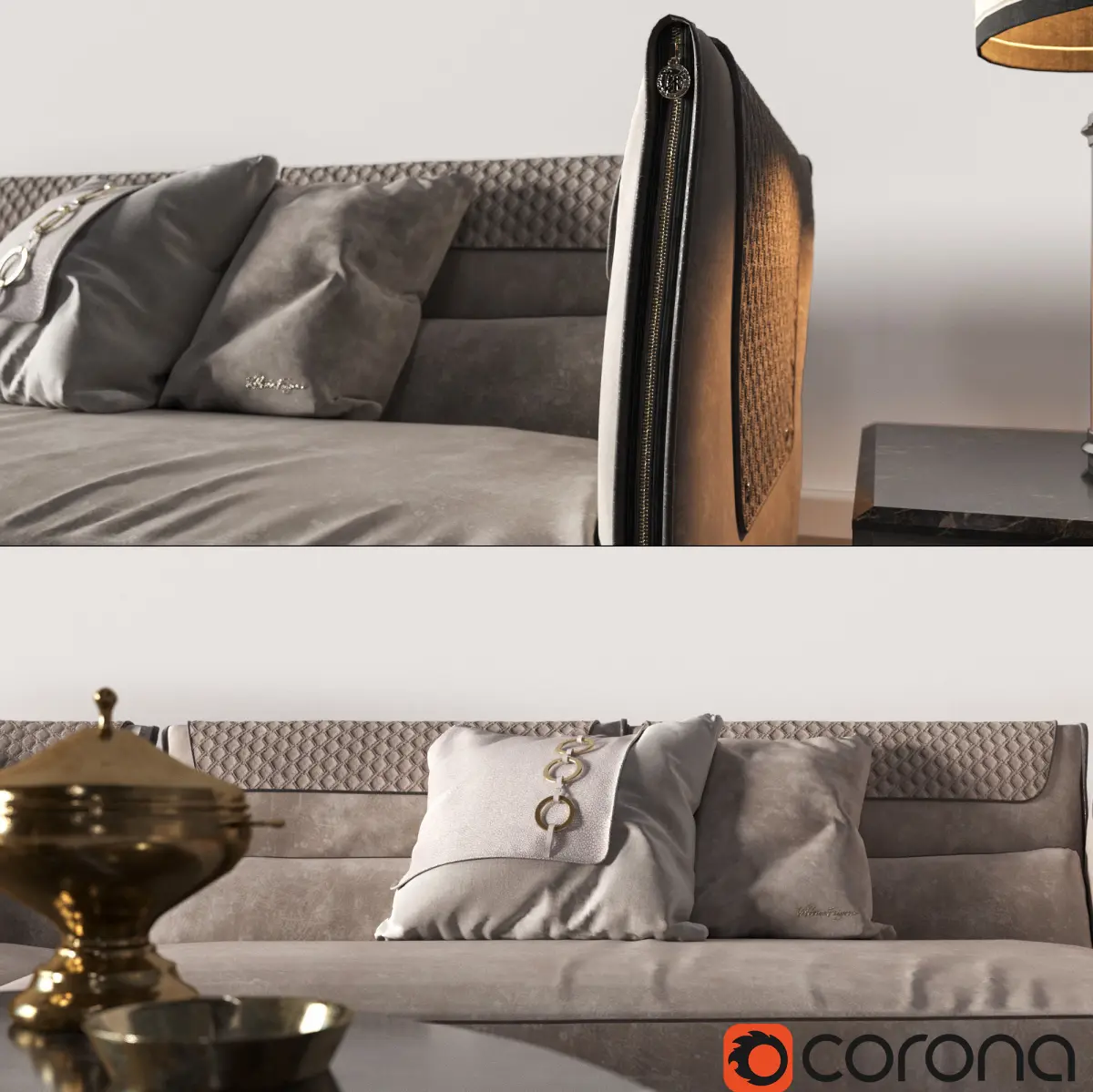 Sofa CLIVIOArmchair GREPPI HIGHTables ESTECoffe tables with lampDecor (plant,old books, vases)