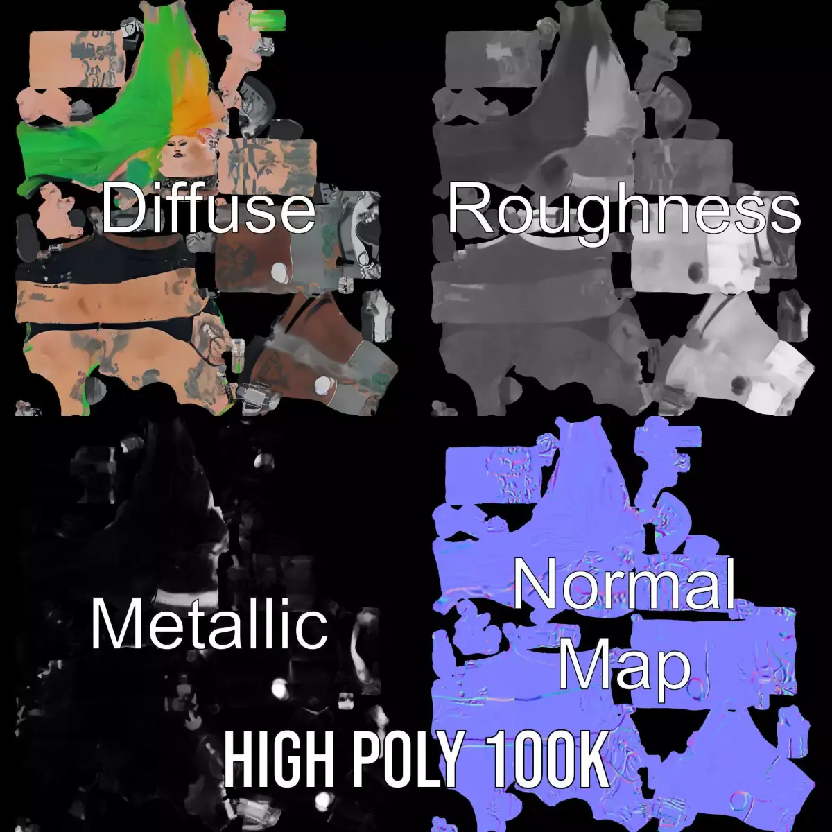 This pack includes models with three levels of detail: low-poly, middle-poly, and high-poly for various applications like gaming, animations, and presentations. The texturing is PBR-ready with Diffuse, NormalMap, Reflection, Roughness, and Metallic maps, all in a generous 4096*4096 resolution, ensuring stunning visuals across rendering engines. Models have accurate UV mapping with no overlapping UVs.