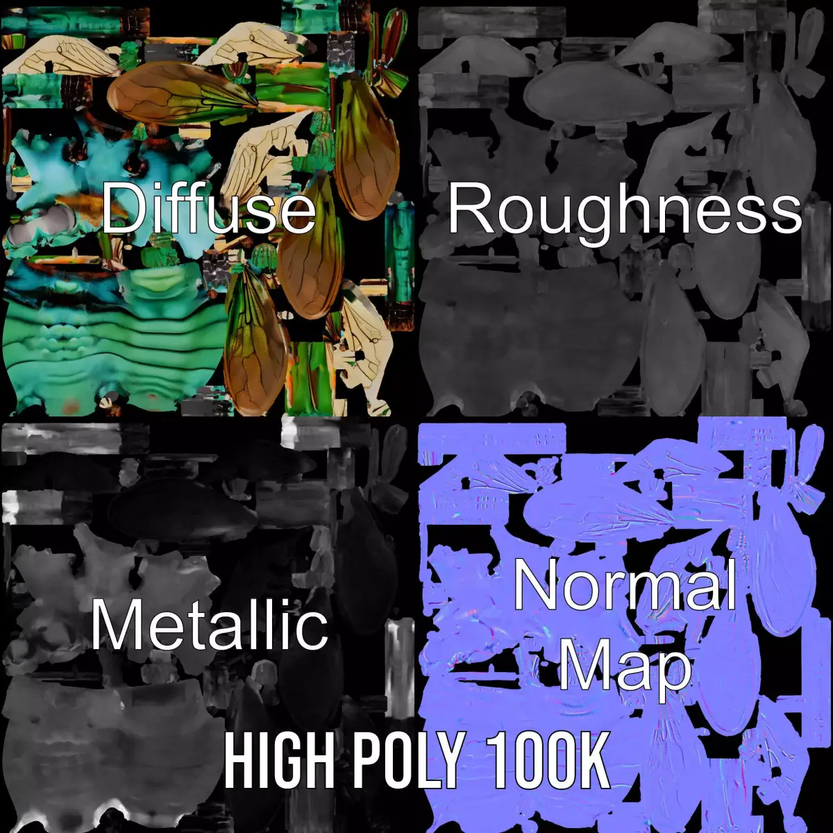 This Vivid Emerald Insect model pack features a unique hybrid creature, combining the elements of an insect with human arms, crafted in striking green hues. Each model has 3 levels of detail: low-poly (1000 triangles for mobile), middle-poly (10,000 triangles for environment), and high-poly (100,000 triangles), which allows for the use of this model in production rendering (such as 3ds Max, Maya, Cinema4D, Blender, Vray/Corona/Cycles and all others), game engines (Unity and Unreal compatible), and interactive presentations, providing a choice of detail based on the LOD System principle. Perfect for fantasy environments, scientific visualizations, or creative animation projects. The model's textures are PBR, Diffuse, NormalMap, and reflection/roughness/metallic, suitable for any modern rendering engine. All models accurately unwrapped and have no overlapping UV. Textures are 4096*4096 in size. Please like and leave a comment if you enjoyed the model!