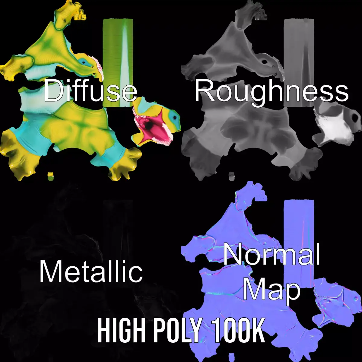 Explore the ancient world with the Vivid Tyrannosaurus model pack. This vibrant 3D representation of a Tyrannosaurus features realistic textures and colors, capturing the essence of this iconic dinosaur. Each model has 3 levels of detail: low-poly (1000 triangles for mobile), middle-poly (10,000 triangles for environment), and high-poly (100,000 triangles), allowing for use in production rendering (such as 3ds Max, Maya, Cinema4D, Blender, Vray/Corona/Cycles), game engines (Unity and Unreal compatible), and interactive presentations. Ideal for educational content, game environments, and animation projects. The model's textures are PBR, Diffuse, NormalMap, and reflection/roughness/metallic, suitable for any modern rendering engine. All models are accurately unwrapped with no overlapping UVs. All textures are 4096x4096 in size. If you enjoy this model, please like and leave a comment!